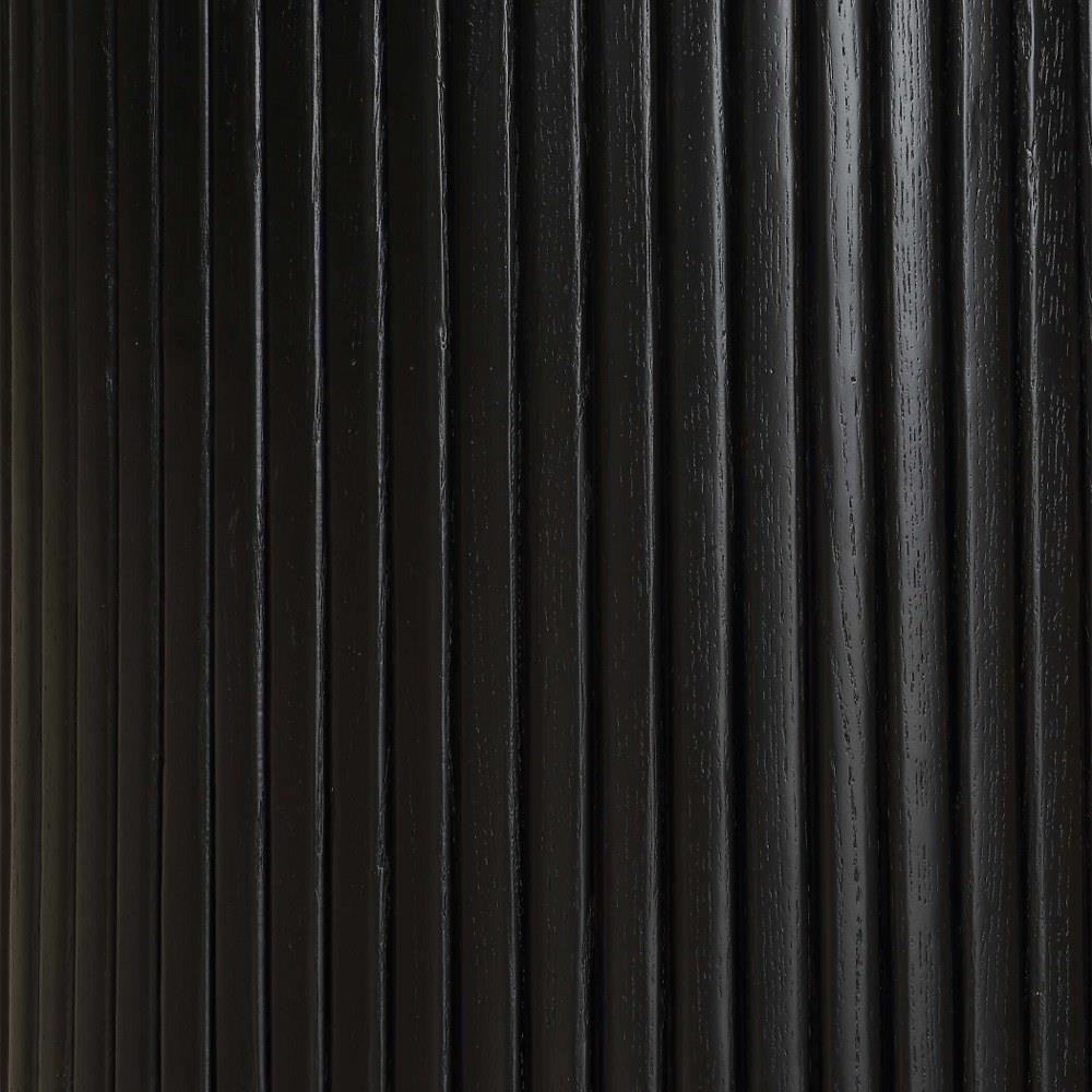 This Round Dining Table Is Crafted From Primarily Solid Oak Wood And Finished In A Rich Black Hue, Offering A Perfect Blend Of Contemporary Style And Natural Durability. The Thick, Fluted Base Leg Adds A Bold, Architectural Touch, Enhancing The Table's Elegant Design.