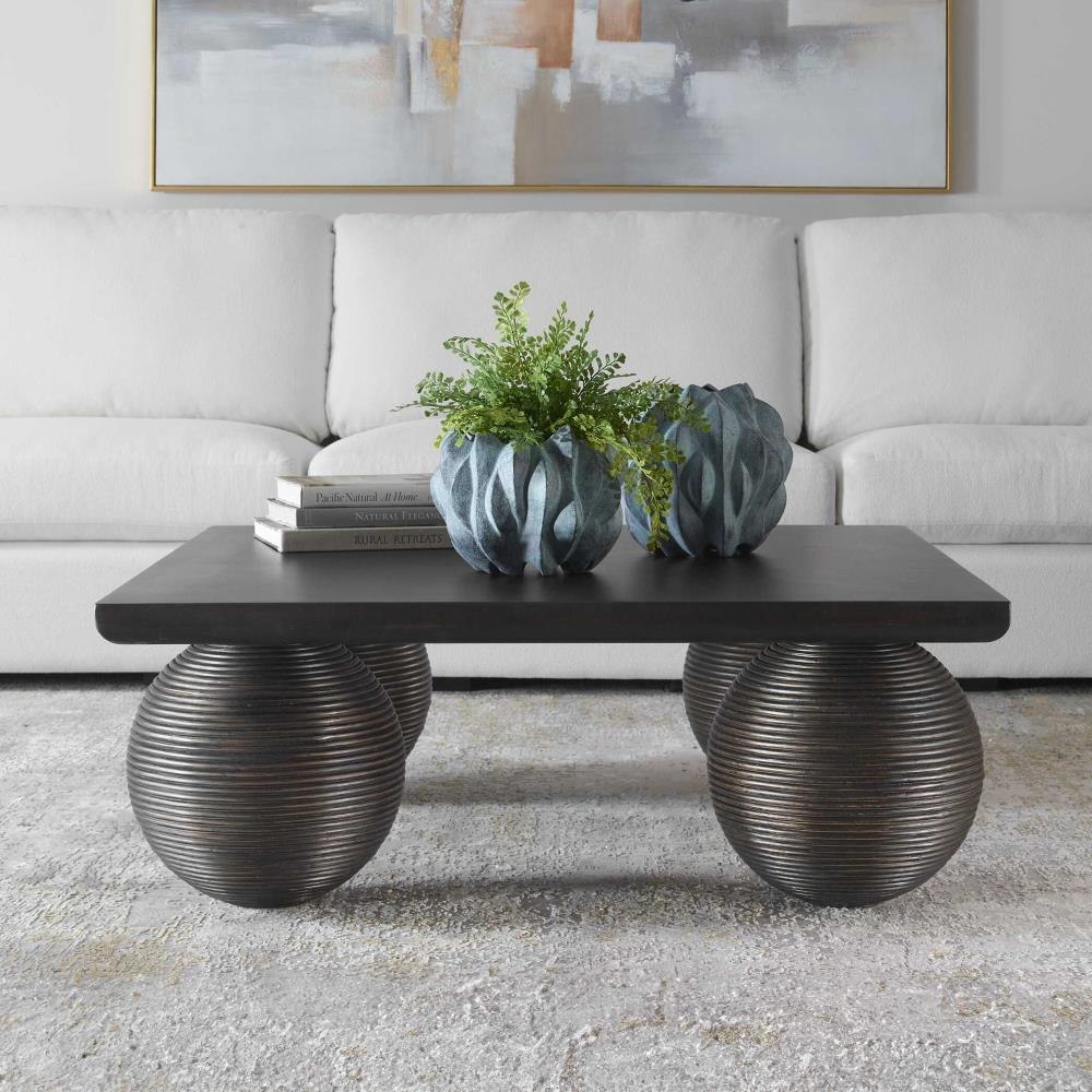 This Coffee Table Is Sure To Be The Focal Point Of Any Room, Featuring Oversized Rattan-covered Spheres As Legs. The Table Is Crafted From Mango-wood Veneer And Finished In A Distressed Black.