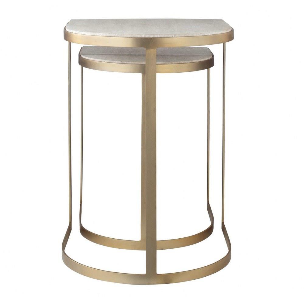 A Sophisticated Pair Of Nesting Tables Featuring A Curved Metal Strap Frame In A Refined Gold Finish And Two Elegant Travertine Tabletops.