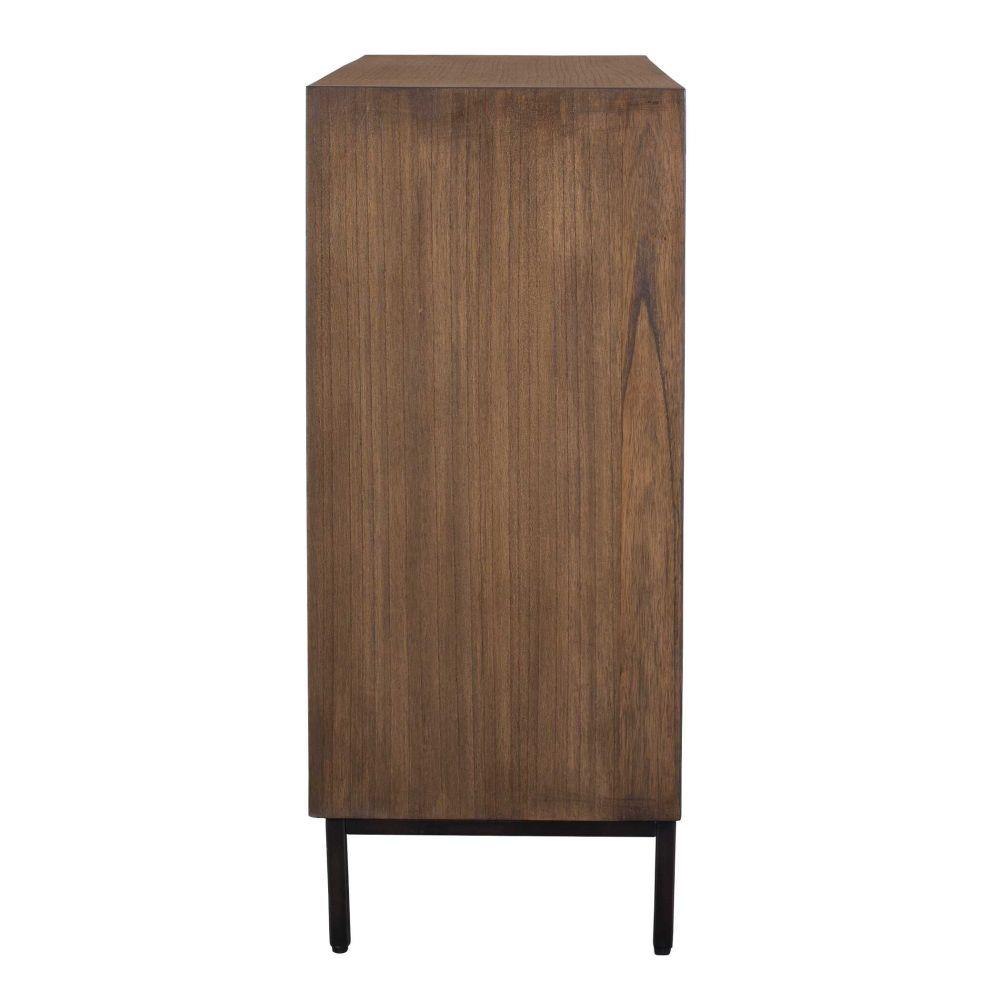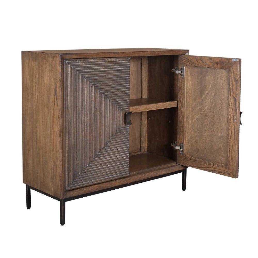 Crafted From Mindi Wood In A Warm Finish, The Bottom Line Two-Door Cabinet Features Carved Detailing That Accentuates The Natural Wood Grain And Design, Beautifully Contrasted By Sleek Bronze Metal Legs And Door Pulls.
