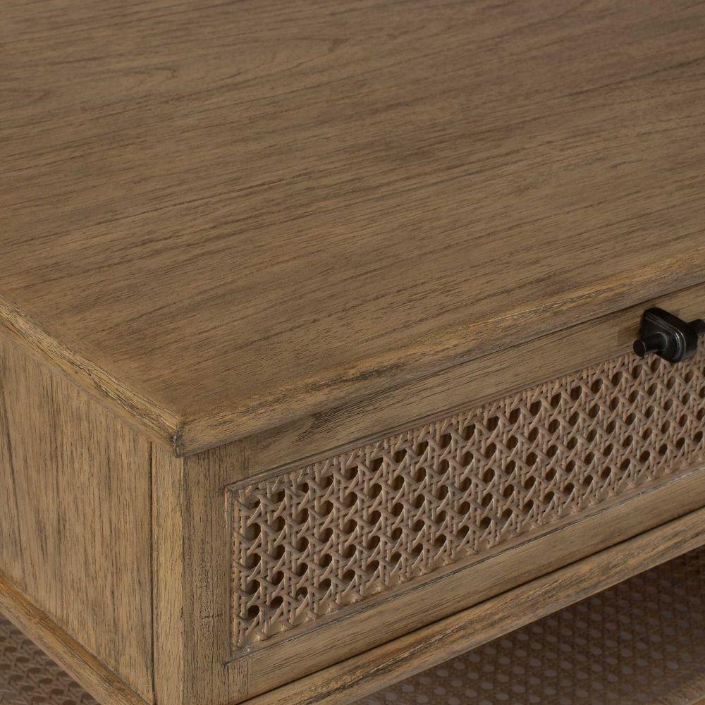 Mid Century Inspired With Accents Of Natural Rattan Cane, This Coffee Table Features Mindi Solids And Veneers Finished In A Soft Oak Stain. The Coast Table Has One Storage Shelf And Two Drawers With Metal Hardware Finished In Dark Gunmetal.
