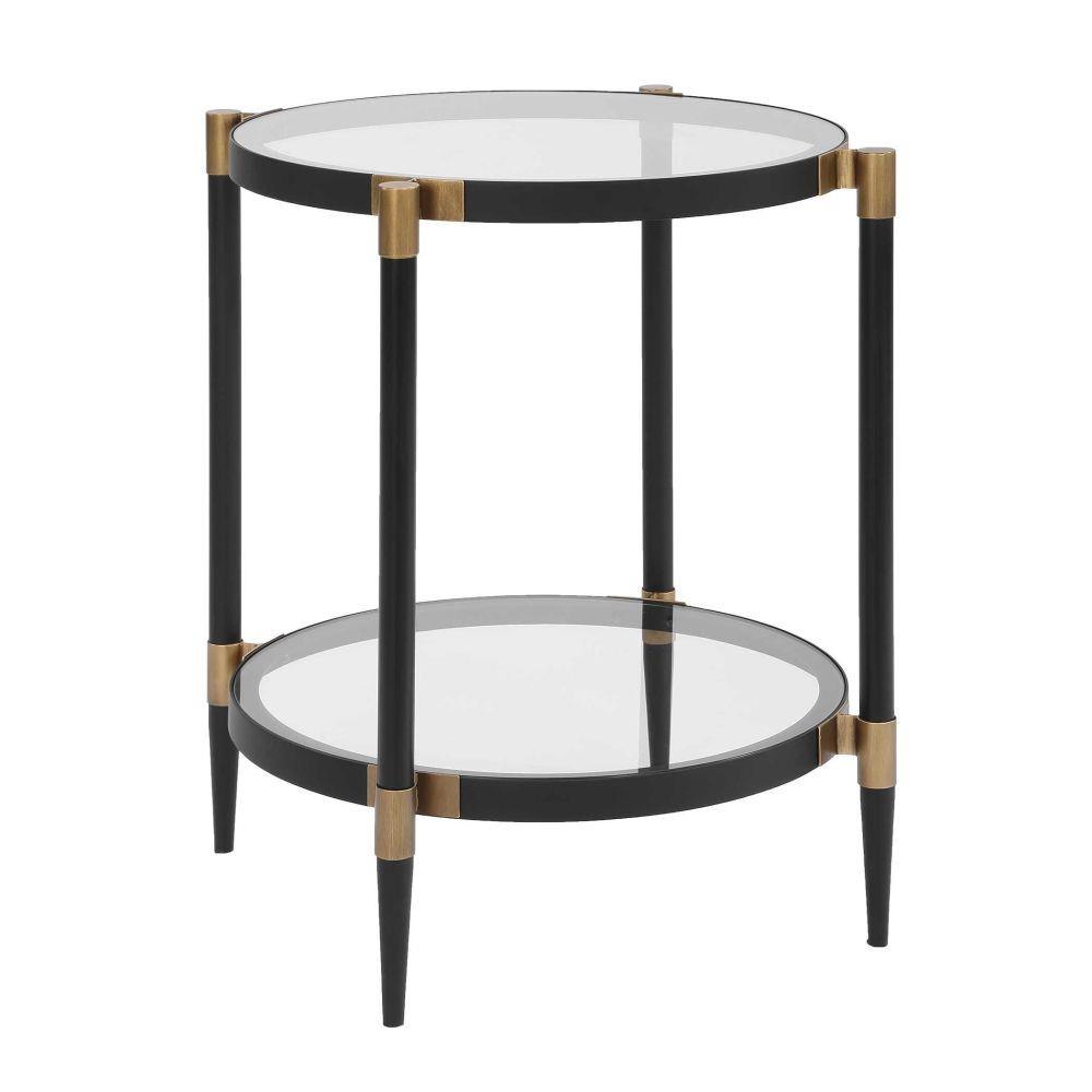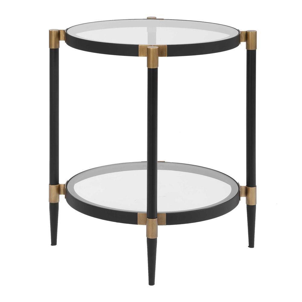 This Elegant Side Table Features A Sleek Black Iron Frame With Sophisticated Gold Accents. It Includes Two Tempered Glass Shelves For A Light And Airy Feel.