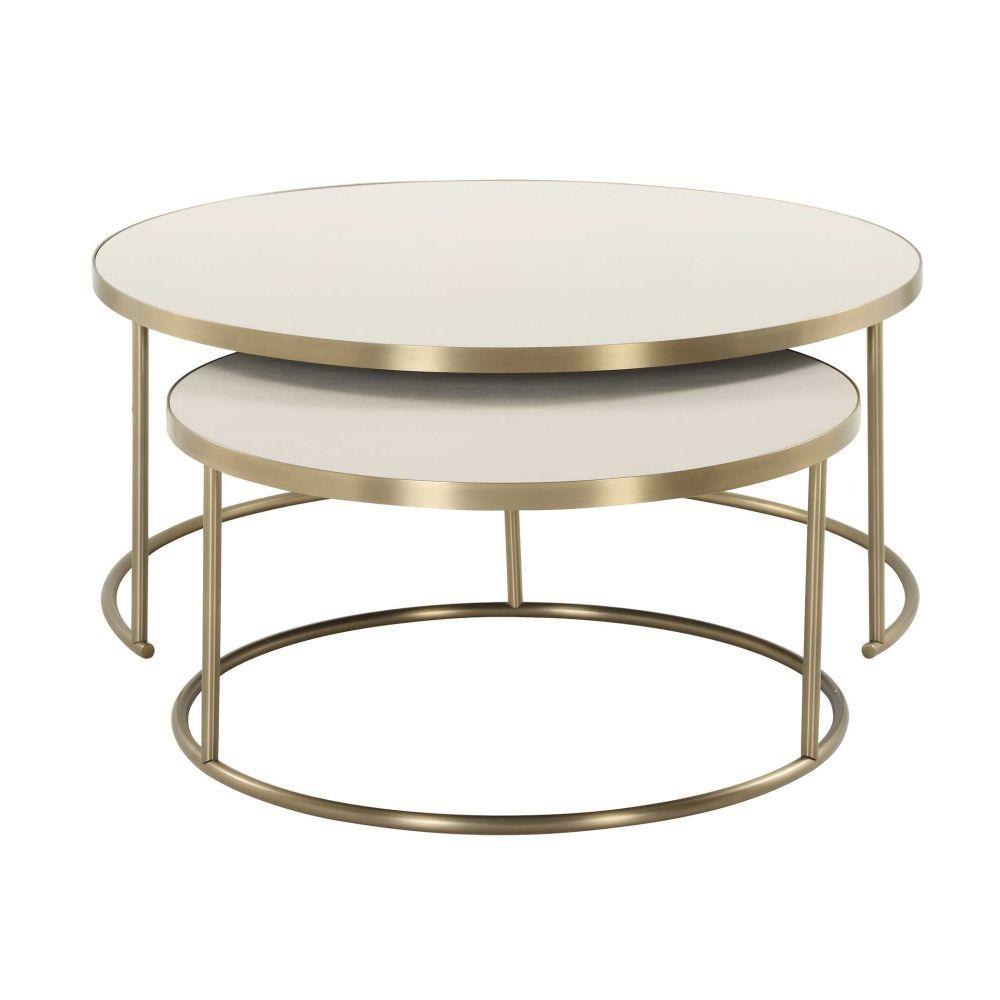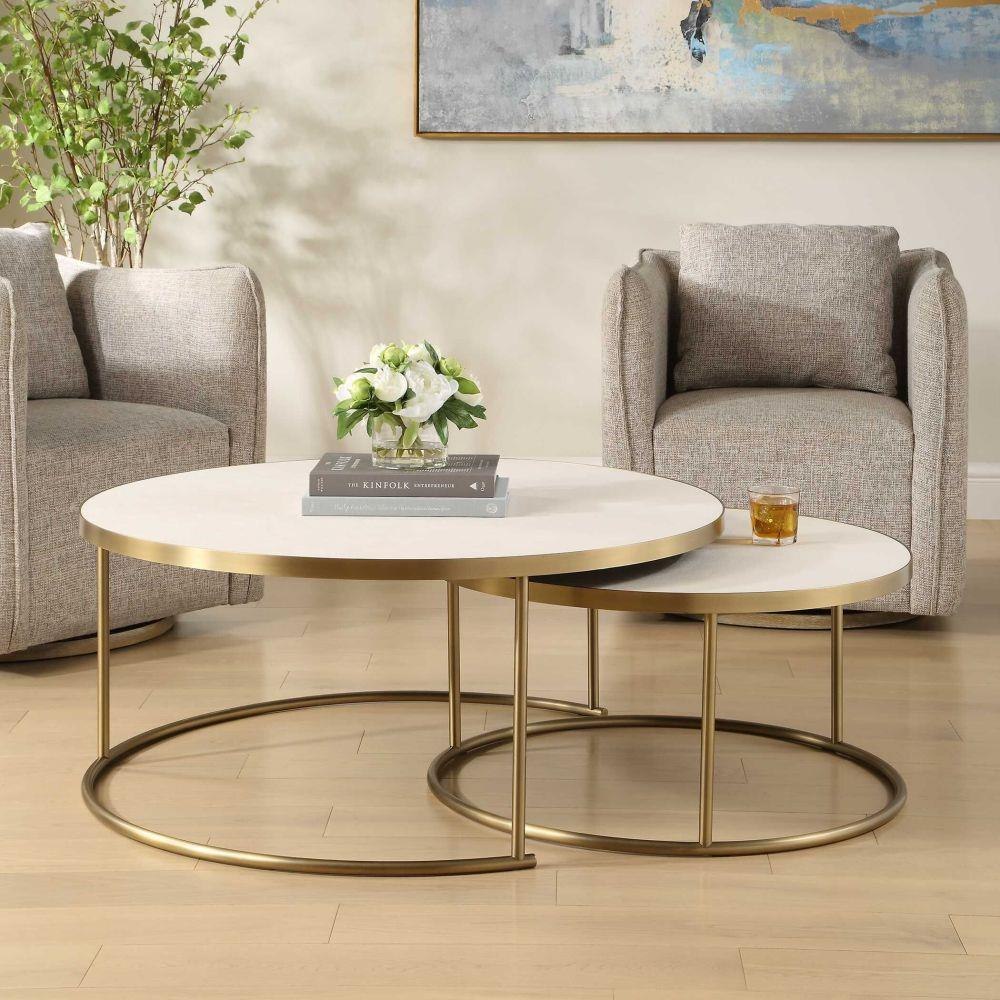 This Set Of Two Functional Nesting Coffee Tables Are Constructed With Brass Plated Metal Bases With Faux White Shagreen Wrapped Tops.