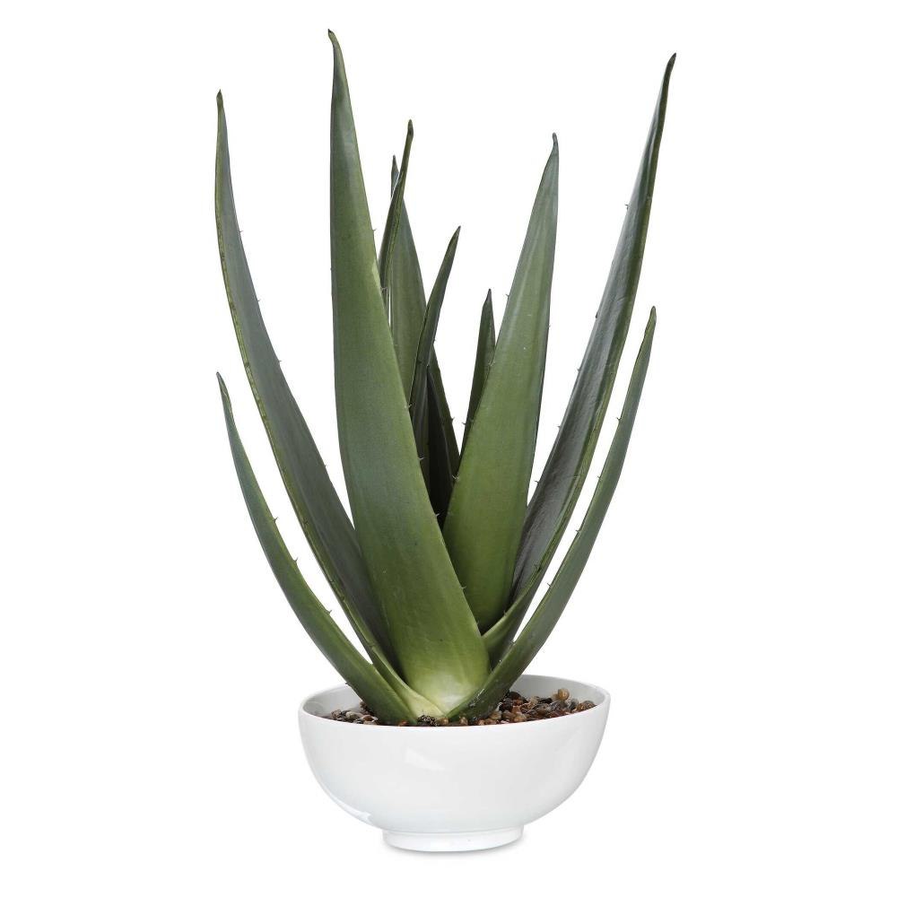 A Contemporary Aloe Vera Statement Piece, Accented With Natural Stones Set Into A Glossy White Textured Bowl.