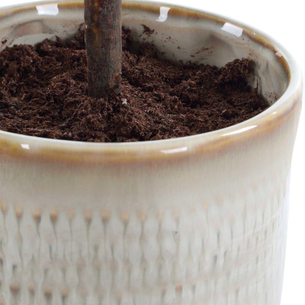 Graceful And Compact, Bringing Timeless Mediterranean Charm To Any Space. Featuring Softly Hued Green And Silvery Leaves And Nestled Into A Textured Ceramic Container, Glazed In Neutral Tan Tones.