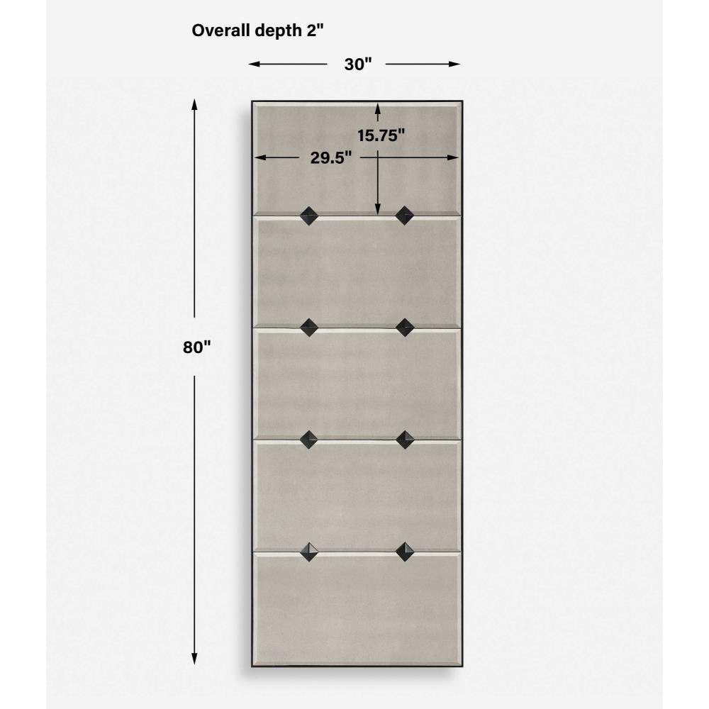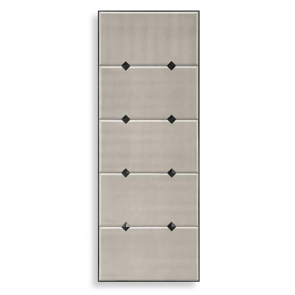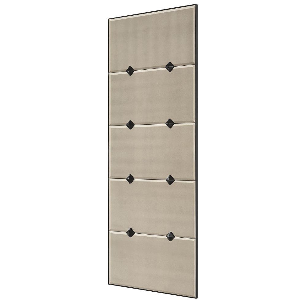This Oversized Mirror Features Antique Style Mirrors With A Petite Bevel For An Updated Traditional Appeal Surrounded By A Slim Black Iron Frame Accented With Matching Metal Studded Medallions. May Be Hung Horizontal Or Vertical.