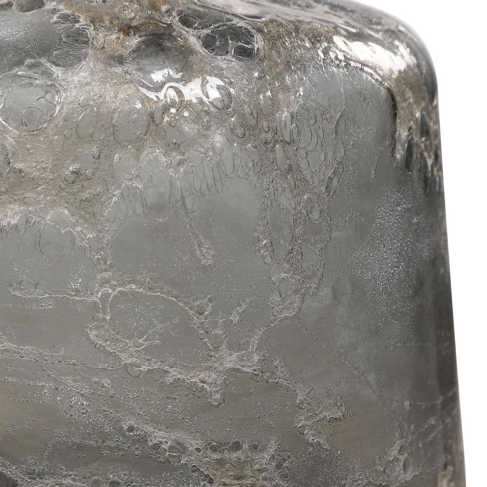 Crafted From Art Glass, These Bottles Showcase A Unique, Heavy Texture And Are Finished In Neutral Shades Of Charcoal, Taupe, And Silver. Each Is Accented By A Silver Leaf Finished Iron Top. Sizes: S-9x15x9, L-6x18x6
