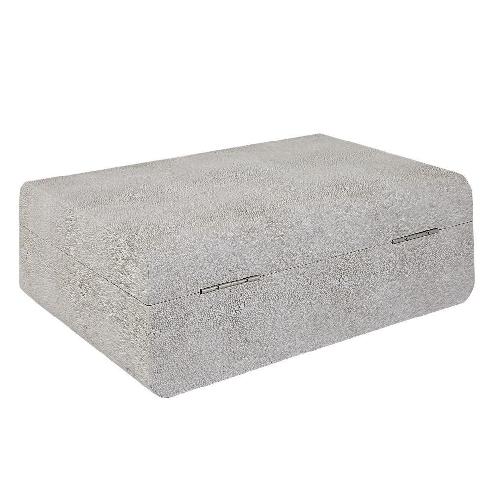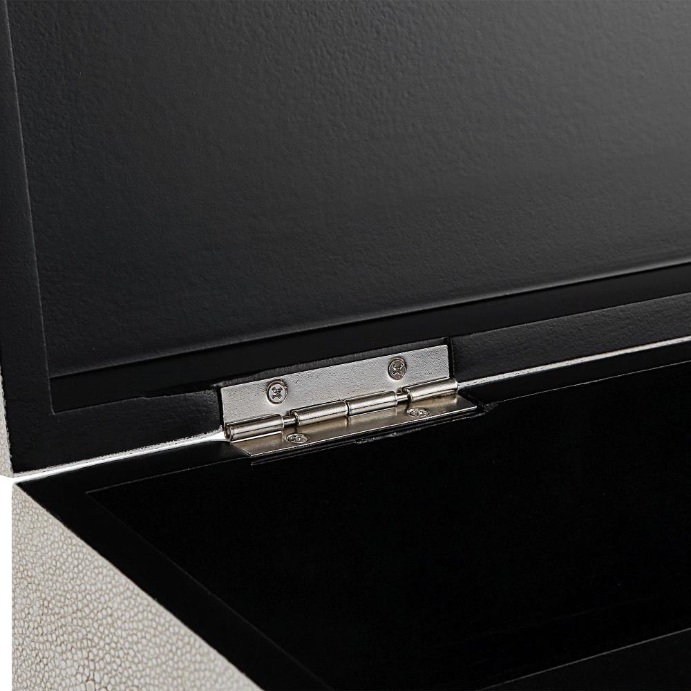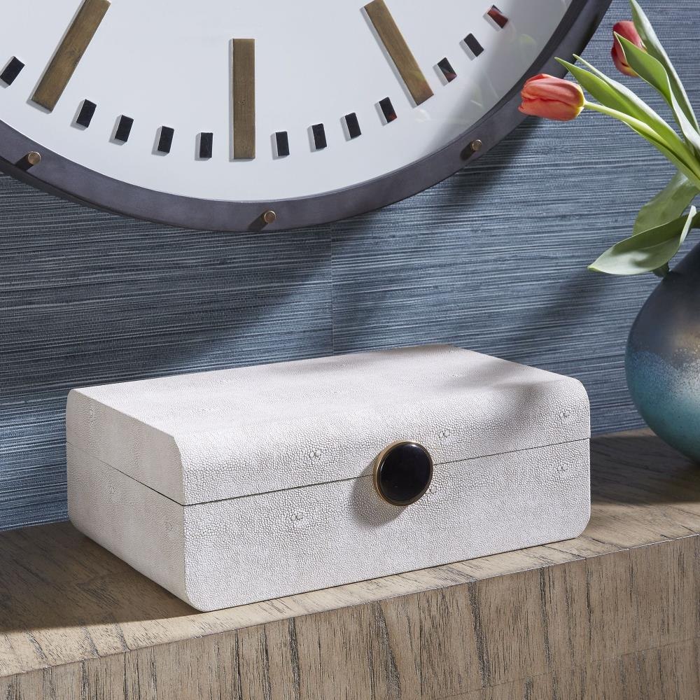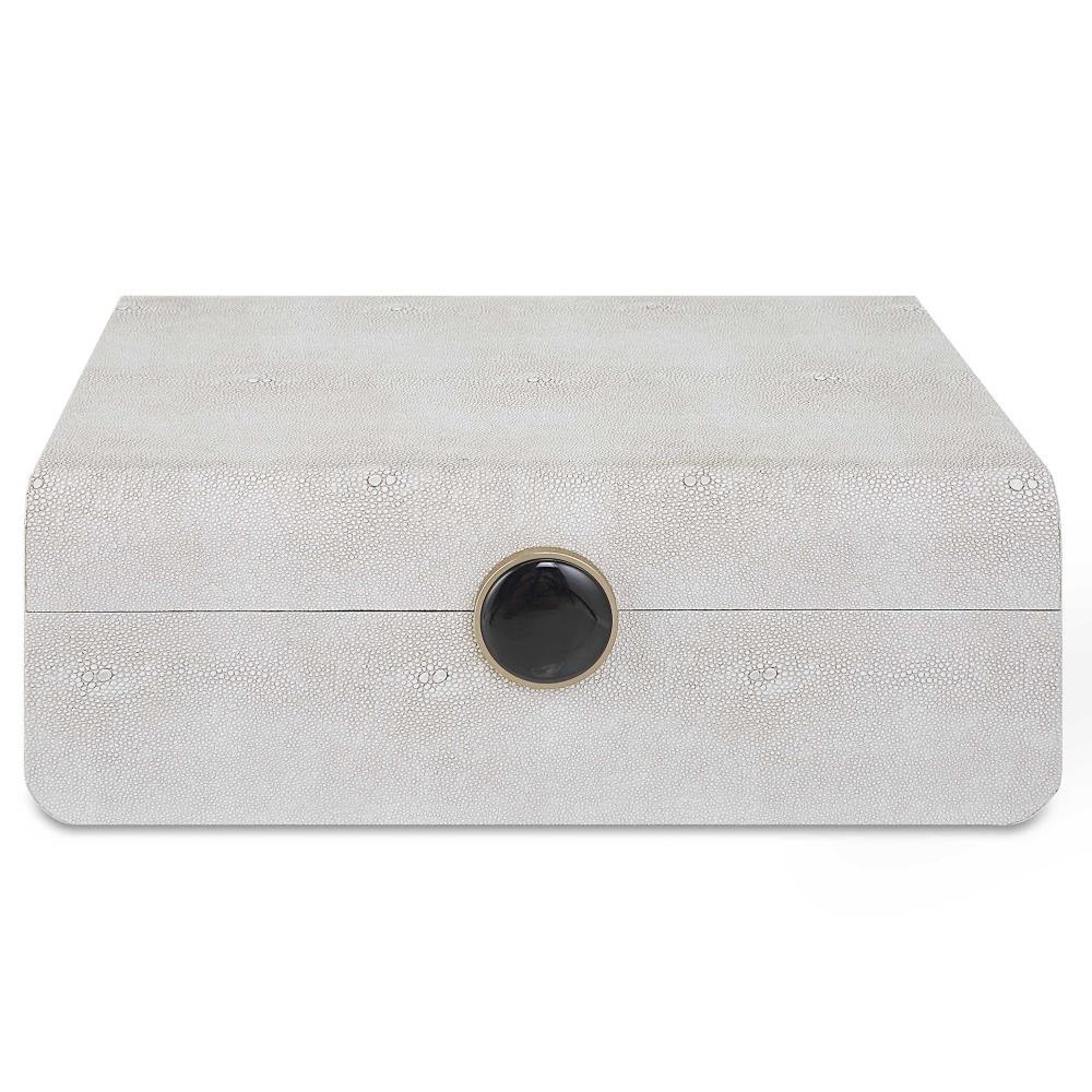 Inspired By The Art Deco Era, This Decorative Box Showcases A Faux White Shagreen Wrapped Exterior Accented By A Brushed Antique Brass And Black Enamel Closure. The Interior Is Finished In Matte Black.