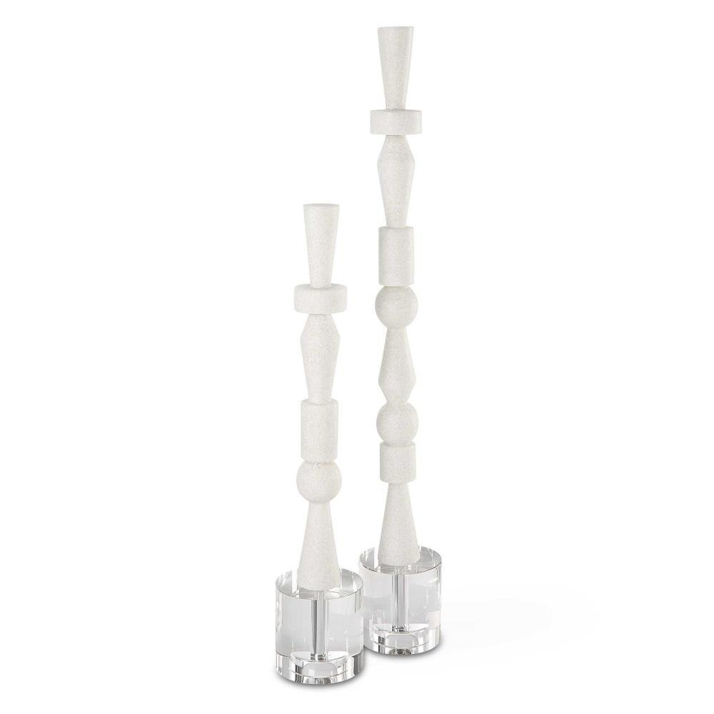 Geometric, Stacked Totems Crafted From Ivory Man-made Stone That Accurately Replicates The Look Of Thassos Marble And Is Accented By An Elegant Crystal Foot. Sizes: S-4x21x4, L-4x28x4