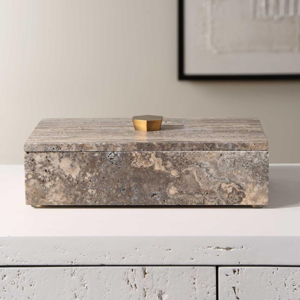 Need An Elegant Hide Away To Stash Small Items? This Gray Unfilled Travertine Box With Bronze Handle And Lift-off Lid Is The Perfect Spot. Because It Is A Natural Stone, Each Piece Of Travertine Is Unique.