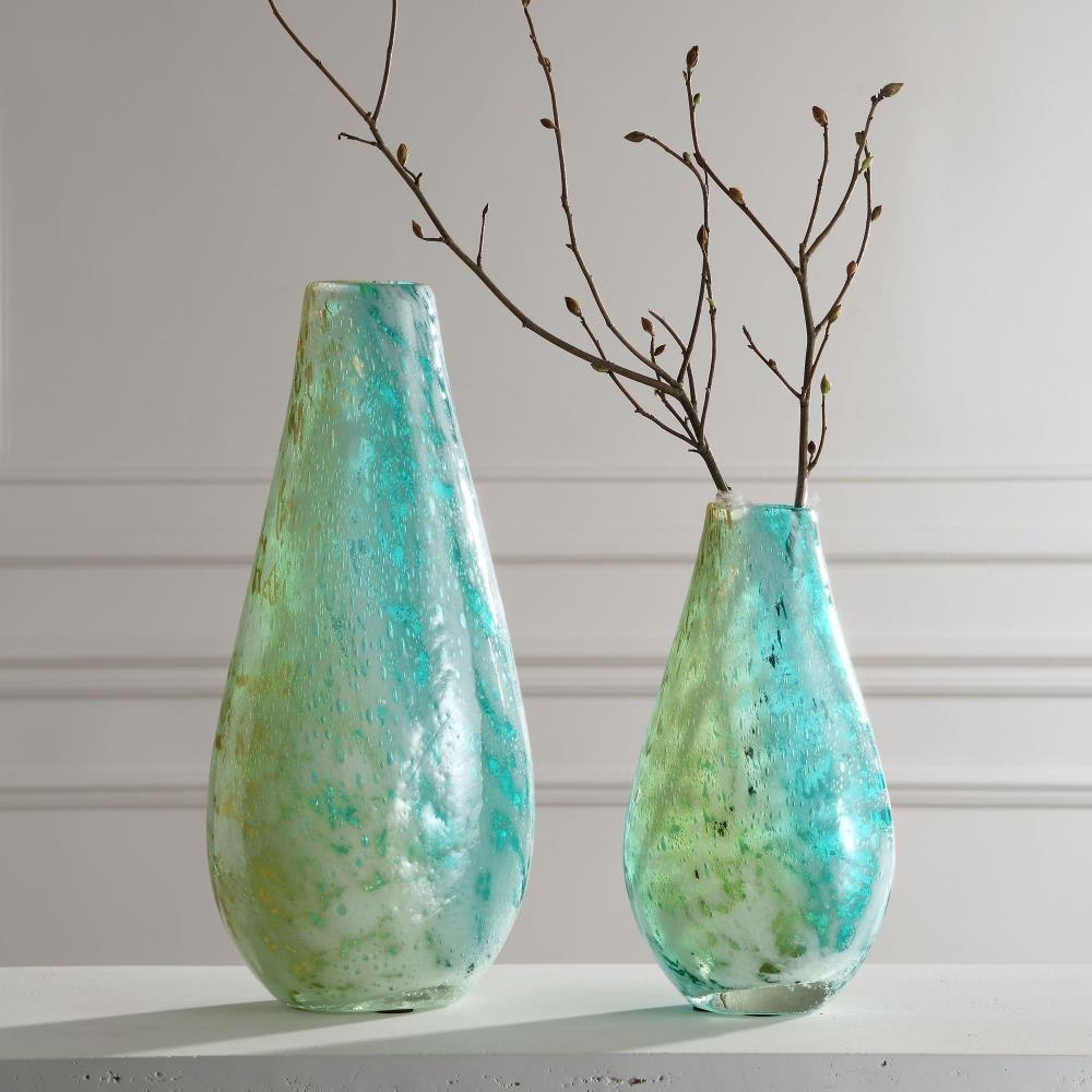 Capture The Serene Beauty Of The Ocean In Your Home With Our Exquisite Teal, Amber, And Gold Bubble Glass Vases. Each Vase Captures The Essence Of Tranquil Waters And Glistening Sands. Perfect For Adding A Touch Of Coastal Charm To Any Space, These Vases Effortlessly Blend Elegance With Natural Inspiration. Sizes: S-4x10x5, L- 4x14x7