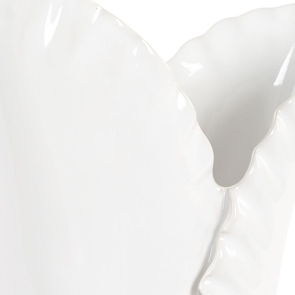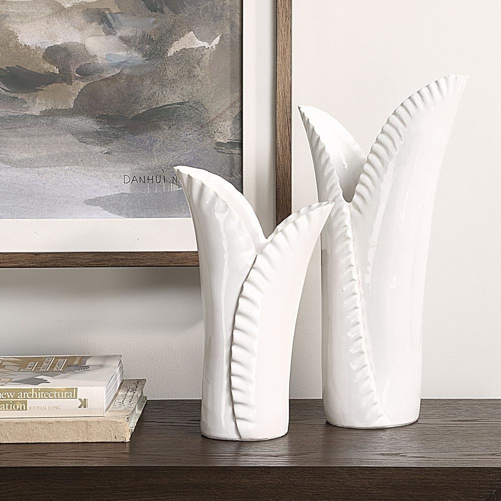 This Set Of Two Beautifully Crafted White Ceramic Vases Captures The Delicate Beauty Of Nature. Inspired By Long Elegant Leaves Found In Nature. The Smooth Finish And Delicately Rippled Edges Highlight Their Refined Design, Making Them Perfect For Showcasing Your Favorite Flowers Or As Standalone Art Pieces. Sizes: S-4x11x7, L-6x15x8