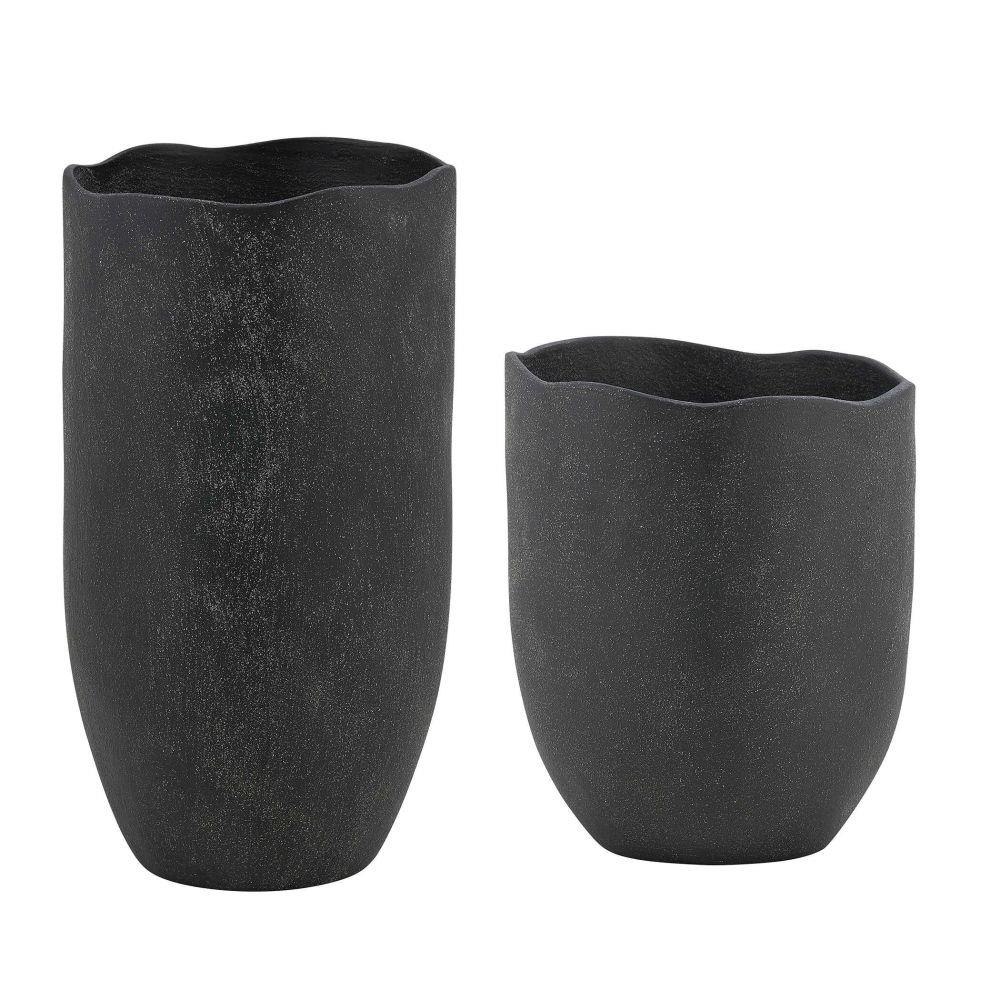 This Set Of Two Earthenware Vases Features A Striking Matte Black Finish With A Rich, Rustic Texture. Their Unique, Organic Shape And Subtle Waved Rim Add A Touch Of Handcrafted Artistry To Any Space. Safe For Outdoor Use, But Protection From Freezing Temperatures Is Recommended. Sizes: S-10x12x10, L-9x17x9