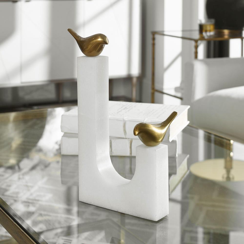 Two Cast Brass, Stylized Songbirds Counterpoised On A White Marble Sling Base.