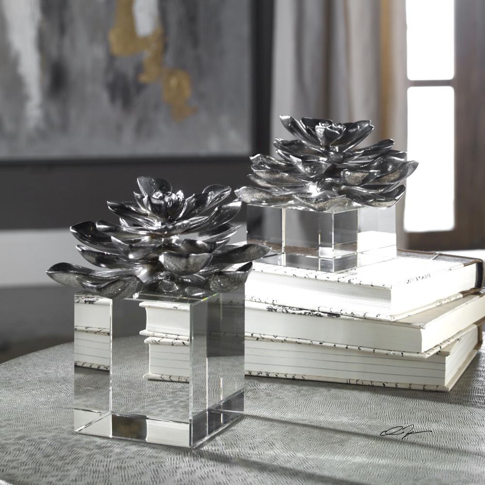 Simple Elegance Is Achieved By These Antiqued, Metallic Silver Lotus Blooms That Appear To Be Floating On Clear Crystal Cubes. Sizes: Sm-6x5x6, Lg-6x7x6