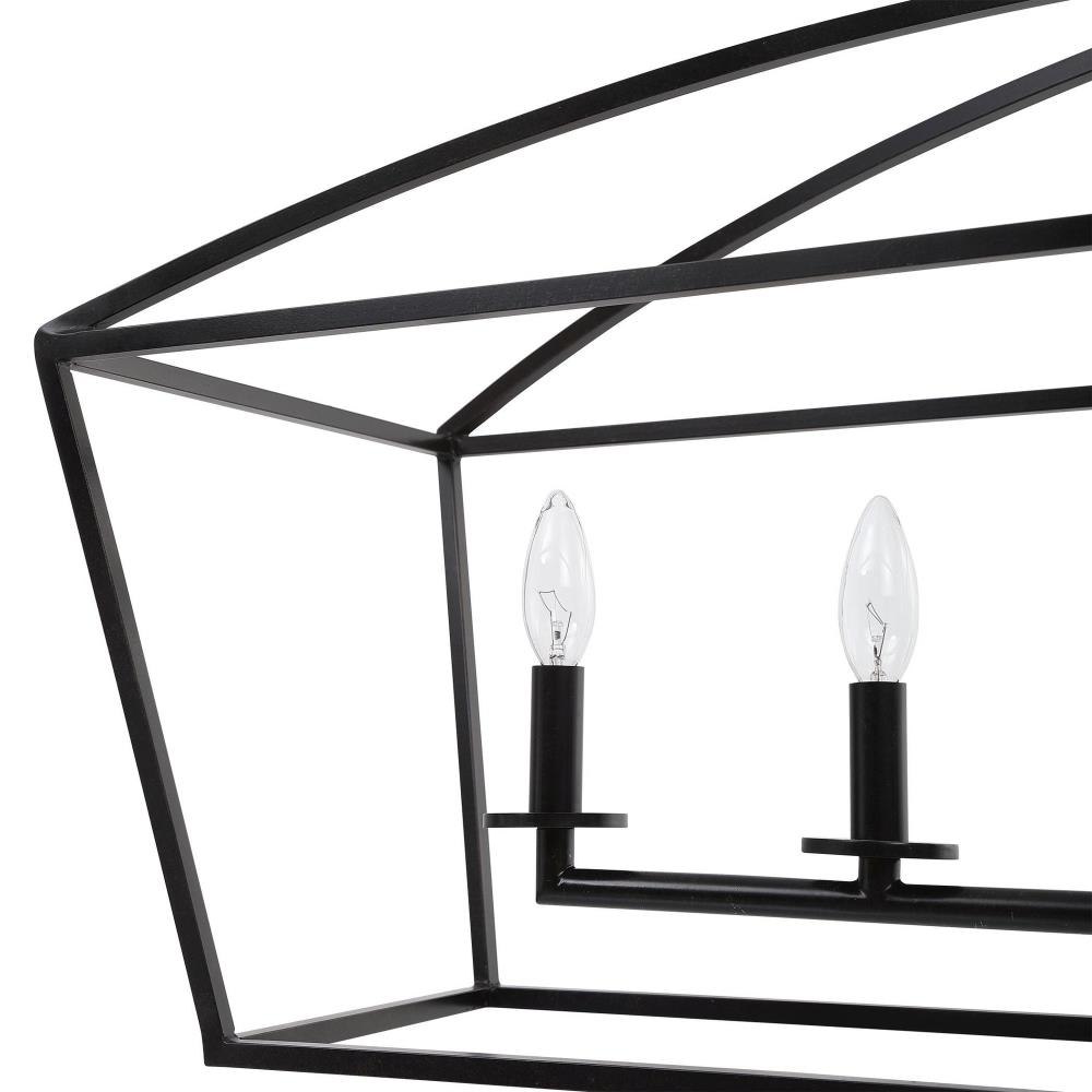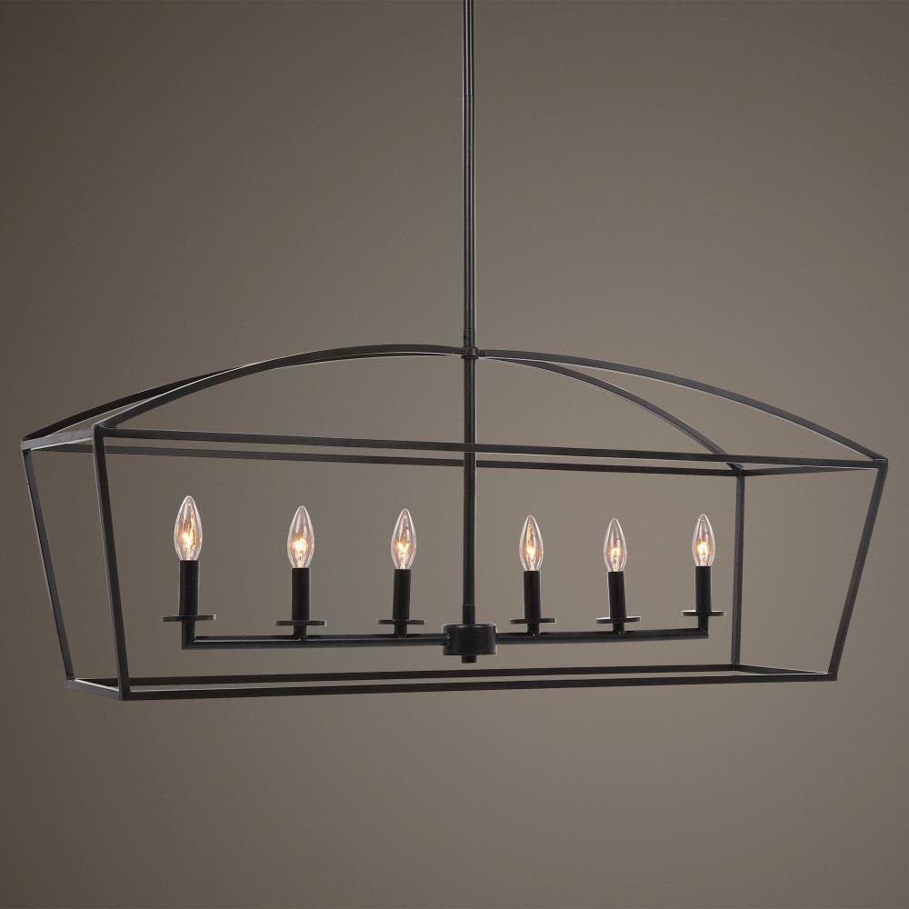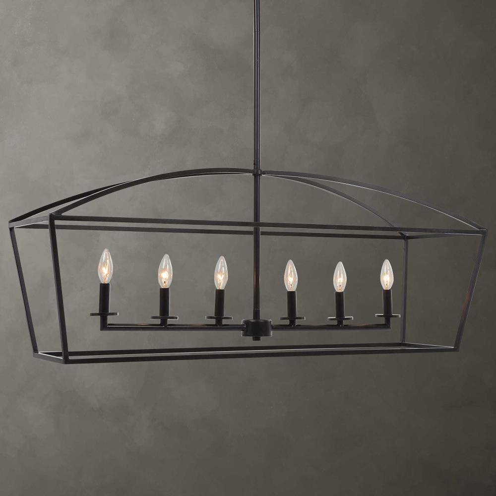 Simple Clean Open Frame Lines Are The Focus Of This Vintage Farm Industrial 6 Lt. Linear Chandelier. The Deep Dark Weathered Bronze Finish Is Modernized With A Matte Luster. 6-60 Watt Max, Candelabra Sockets. Supplied With 20' Wire, 3-12 Inch Stems, And 1-6 Inch Stem For Adjustable Installation.