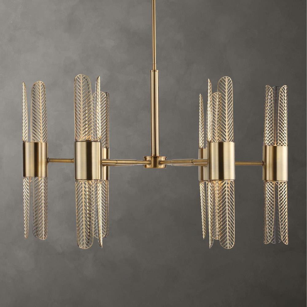 Our Cret Chandelier Is Enriched With Art Deco Lines Inspired By The Cincinnati Union Terminal From 1933. The Body And The Cutout Style Shades Are Generously Refined With A Hand Applied Finish Of Oxidized Brass; With This Finish There Are Shade Variations That Add Depth To The Striking Look. Supplied With 20' Wire, 3-12" Stems And 1-6" Stem For Adjustable Installation. No Bulb Required With The Built-in LED Light Sources; 96 Watt, 3000K, CRI Of 93, 8640 Lumens, 50,000 Estimated Hours Of Illumination,compatible With Lutron DVCL-153P Dimmer.