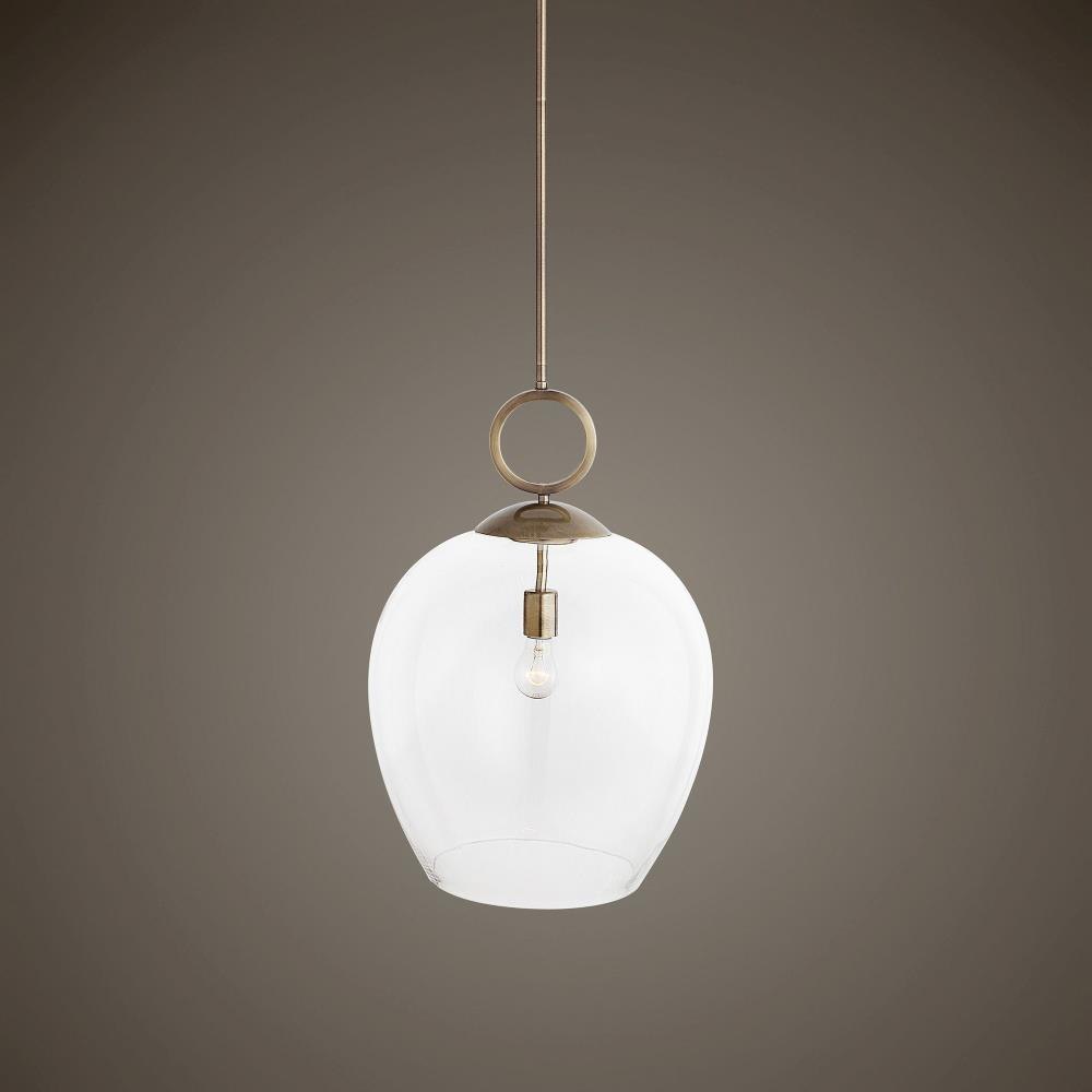 Simple Elegance Best Describes The Extra-large Clear Blown Glass On This Transitional Pendant. Calix Features An Aged Brass Metal Finish Which Has An Ombre Effect Giving A Deeper Hue Of Antique Darkening To Some Areas And Brightening On Others. The Large