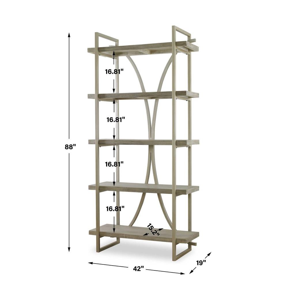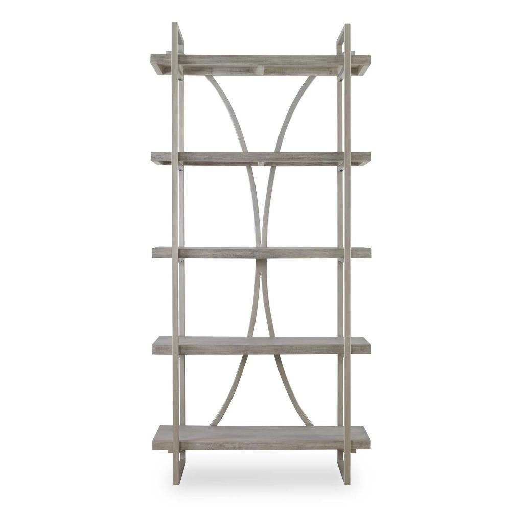 A Classic Contemporary Piece To Transcend Styles, The Sway Etagere Features A Metal Framework Finished In Soft Silver Leaf With Light Antiquing. Shelves Are A Mango Wood Veneer In Distressed Gray With Bone Ivory Undertones.