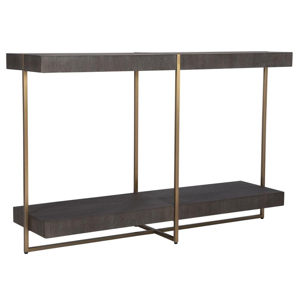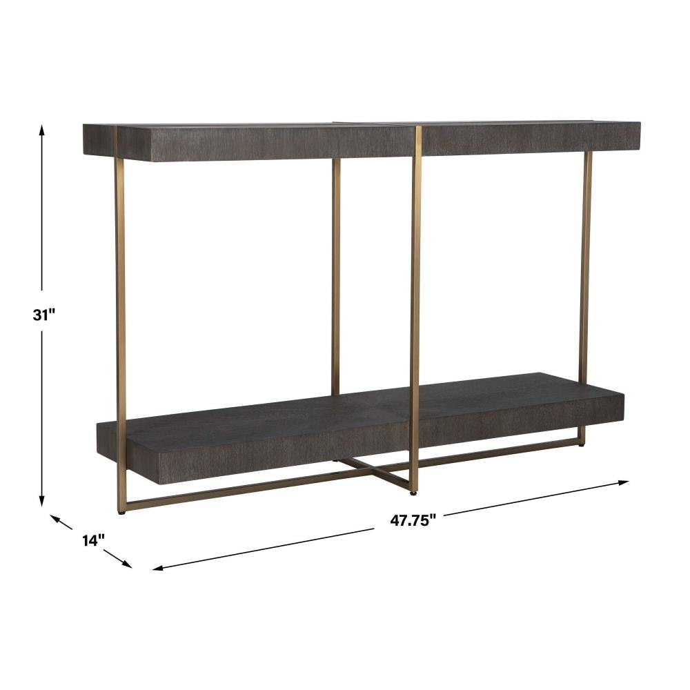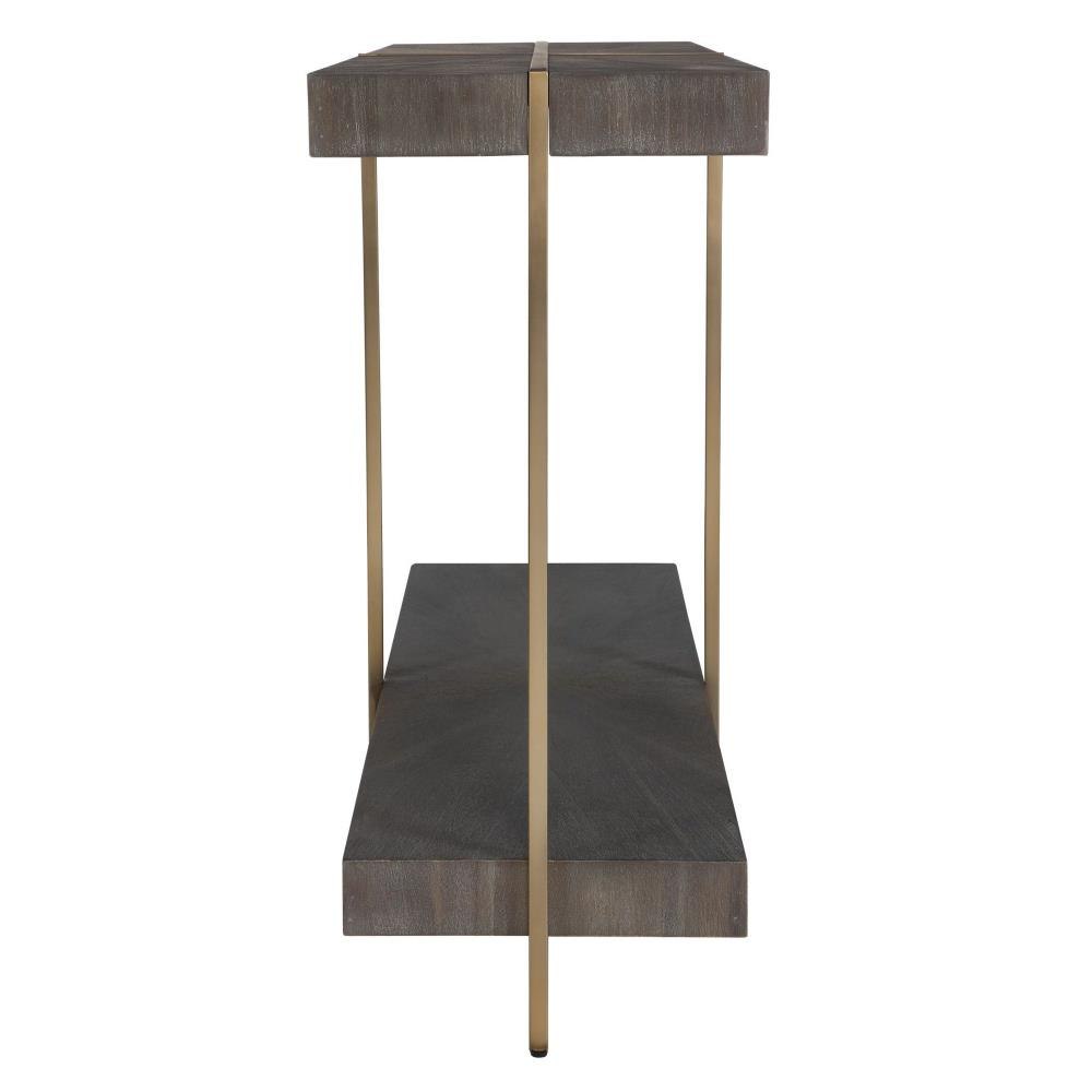 Contemporary In Style, This Console Table Features A Stainless Steel Framework Finished In A Brushed Brass With A Starburst Acacia Veneer Top In A Dark Walnut Stain Washed With A Light Gray Glaze.