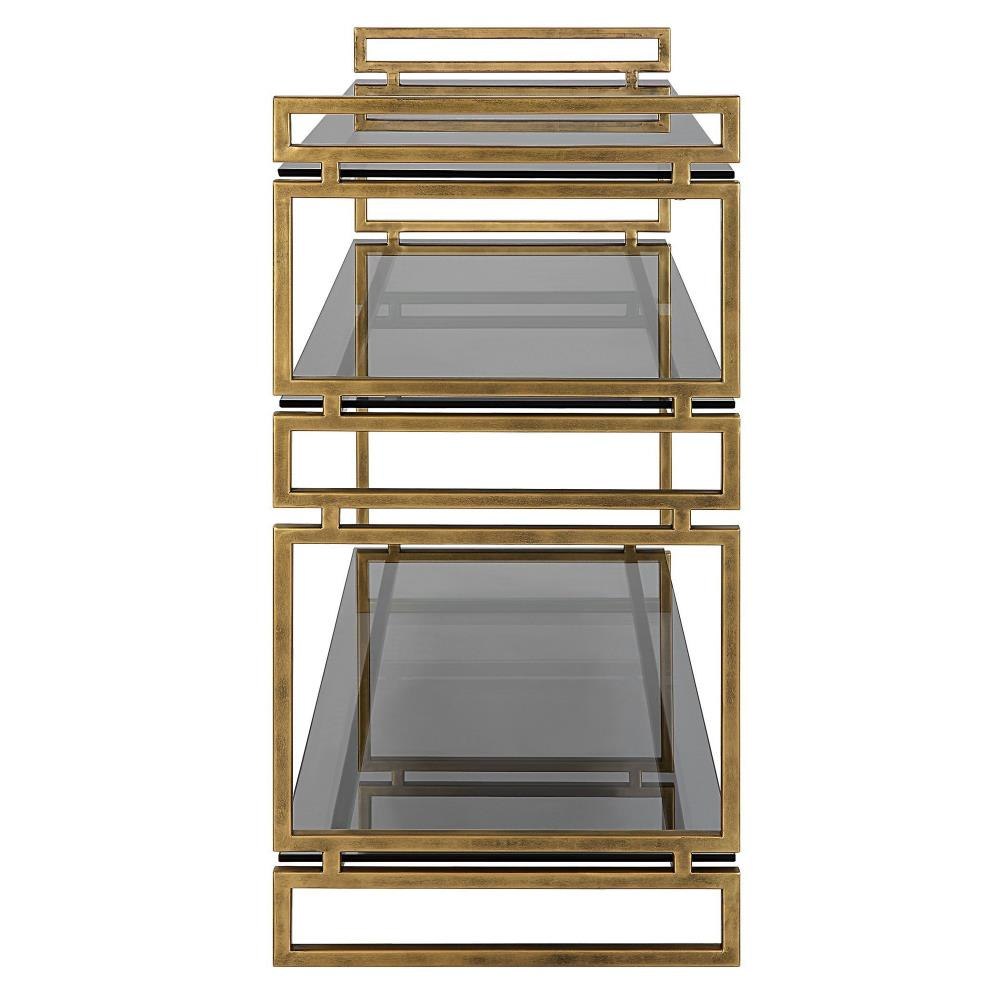 A Functional Accent That Allows For Creativity As Entryway Piece Or Even As A Bar. Features A Striking Combination Of Smoked Gray Glass With Geometric Iron Supports Finished In Lightly Antiqued Gold.