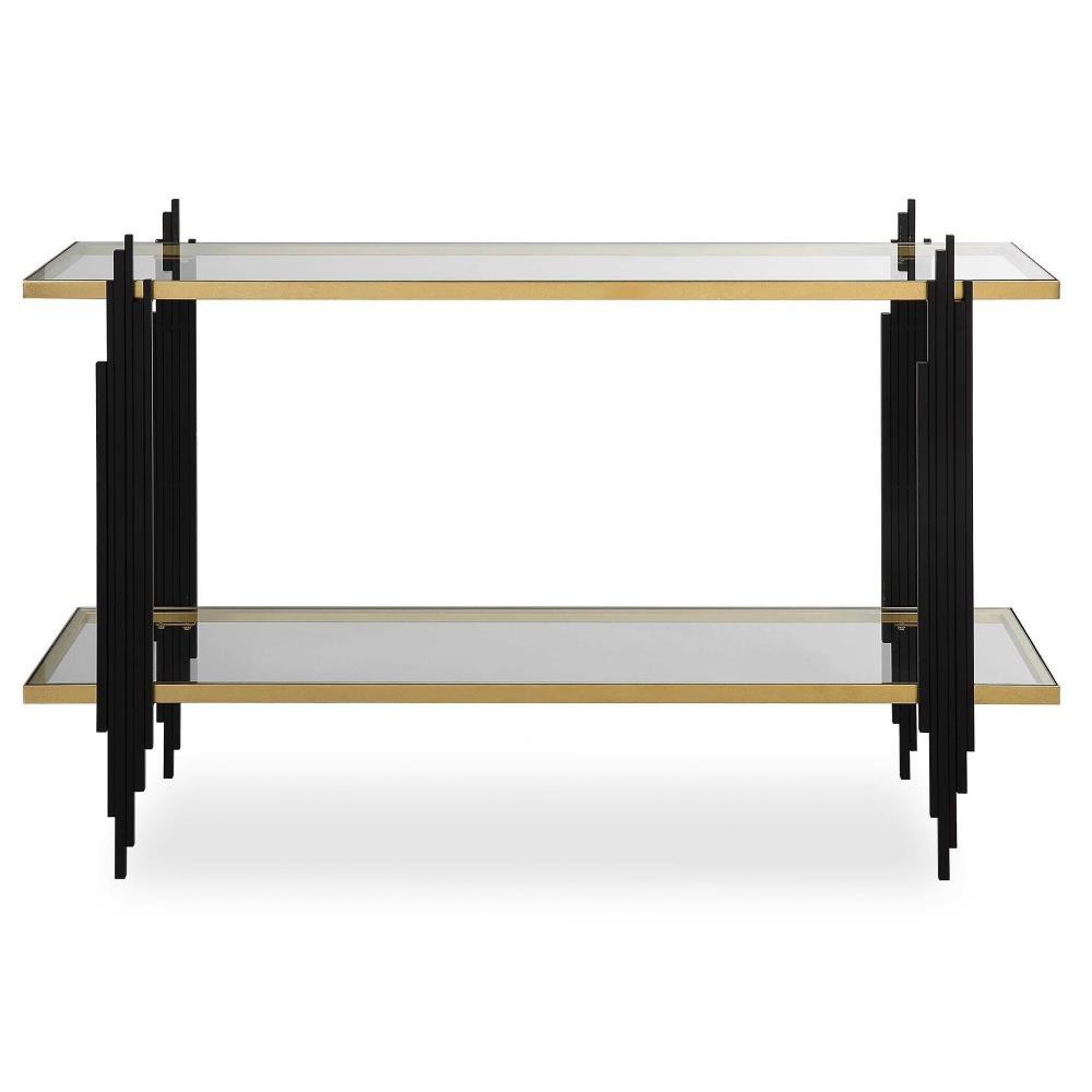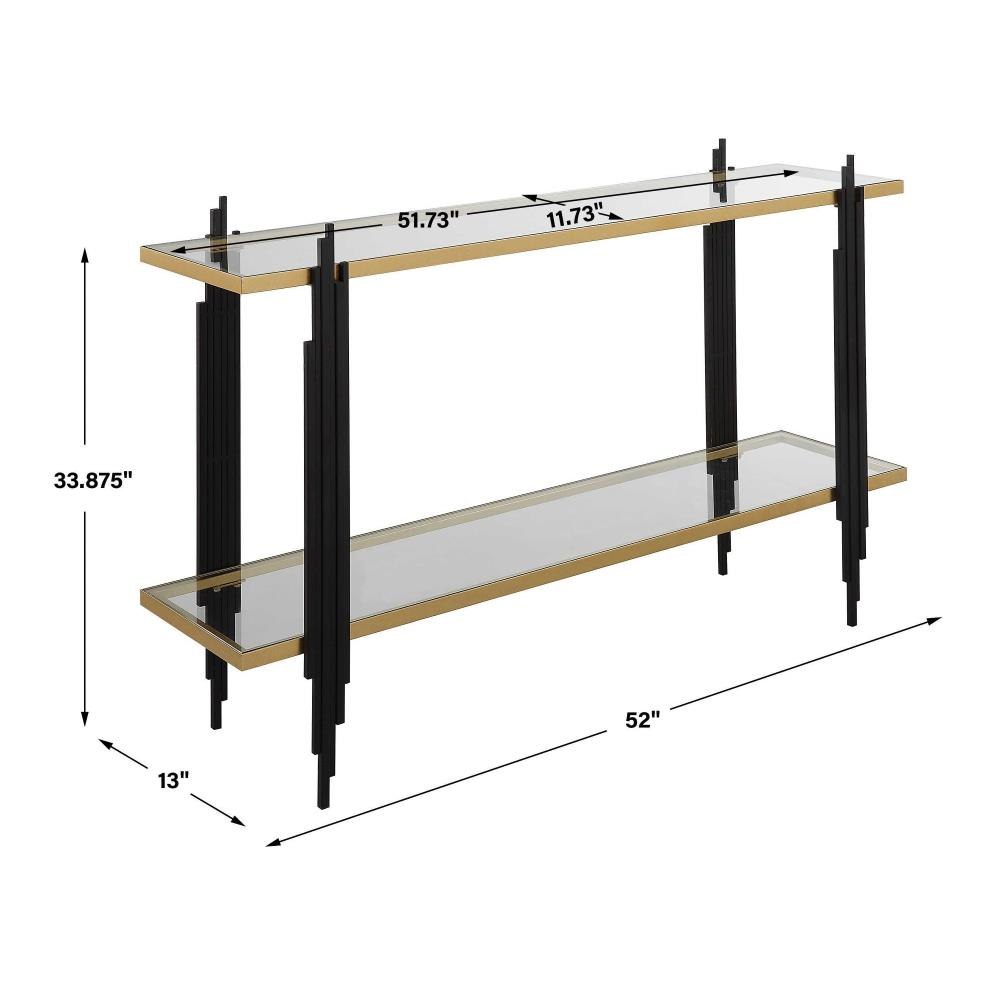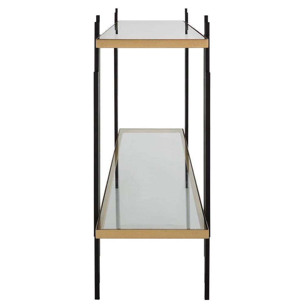 Gold Leaf Shelves Seem To Float Between Matte Black Iron Legs Reminiscent Of A Cityscape. Two Shelves Are Clear Tempered Glass.