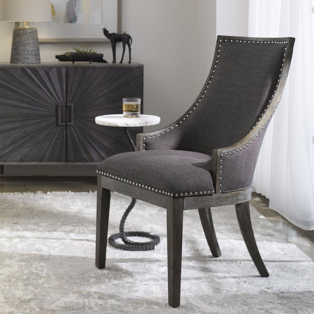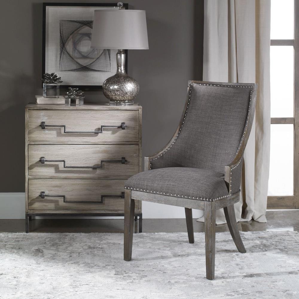 Curved Back Design In Warm Charcoal Gray Linen, Accented By Polished Nickel Nail Head Trim. Honey Stained Frame Is Finished With Heavy Gray Wash. Seat Height Is 20".