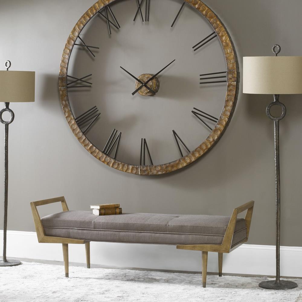 A Bench For Extra Seating With A Mid-century Twist In Its Modern Birch Wood Frame Lightly Finished In A Smooth Oak Finish, With A Tufted Bench Seat In A Woven Taupe Gray Fabric.