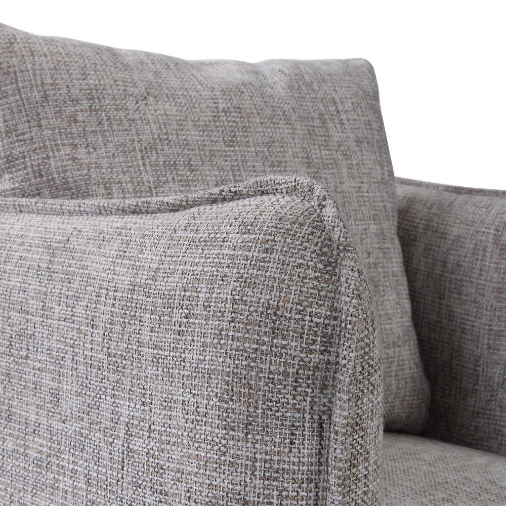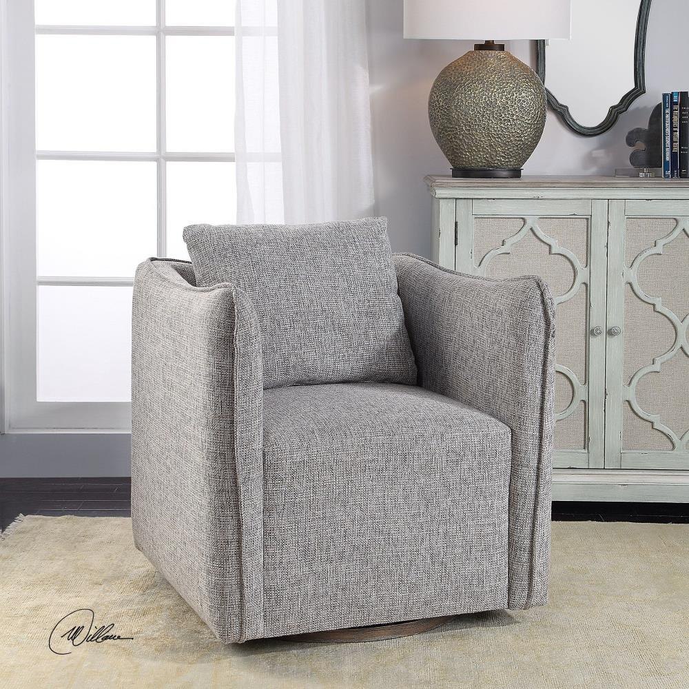 Casual Shelter Arm Accent Chair Tailored In A Woven Linen Blend Fabric In Natural Stone Hues, Featuring A Flanged Edge Trim Complete With A Loose Back Pillow. Rests On A Solid Birch Wood Swivel Base, Finished In A Weathered Gray Stain. Seat Height Is 19".