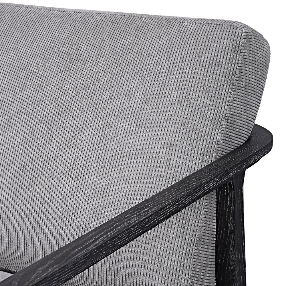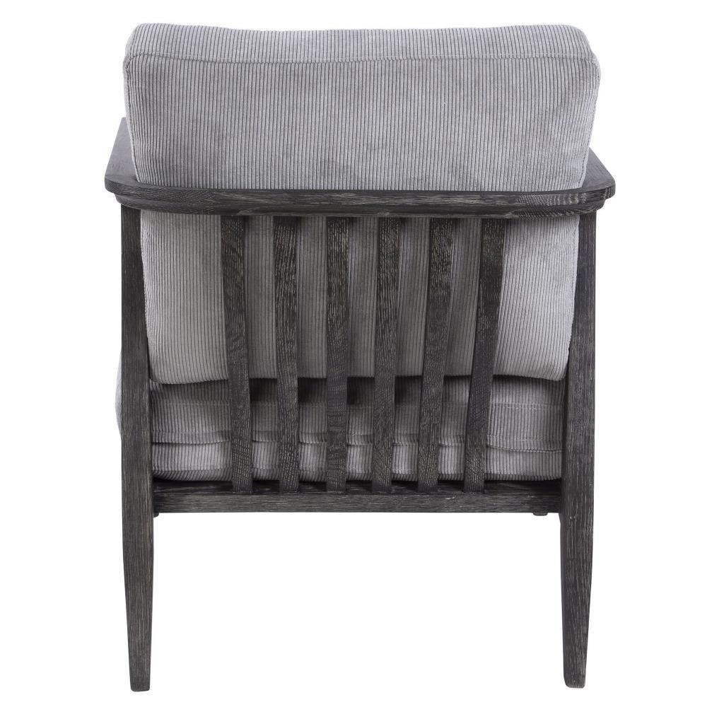 This Refreshing Take On A Modern Accent Chair Features A Curved Open Back Design In Solid Oak Wood. The Dark Ebony Stain Has A Light Gray Glaze Enhancing The Wood Grain. Loose Seat And Back Cushions Are Tailored In A Plush Polyester Channeled Fabric In Steel Gray. Seat Height Is 19".