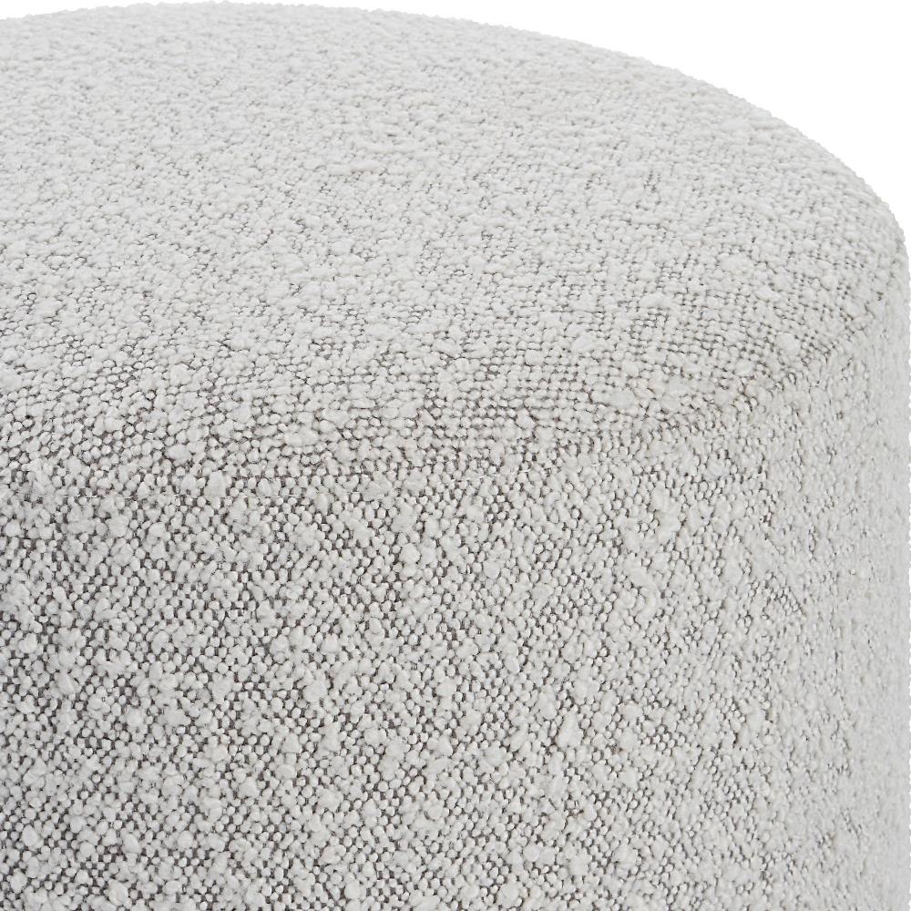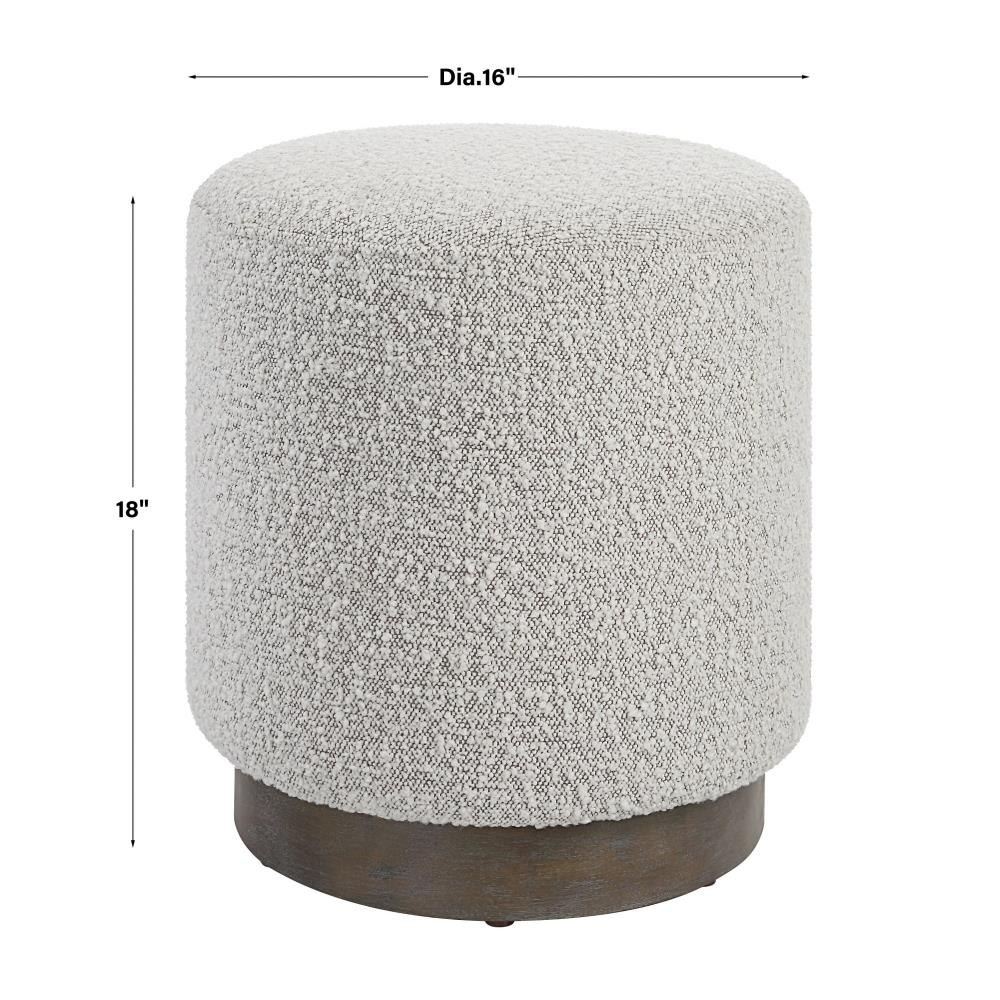 This Plush Ottoman Is Covered In A Casual Ivory And Warm Gray Boucle Fabric With A Natural Walnut Stained Wooden Base. Versatile And Stylish, This Piece Can Be Used As A Seat Or Footrest, Grouped Together Or As A Singular Accent Piece.
