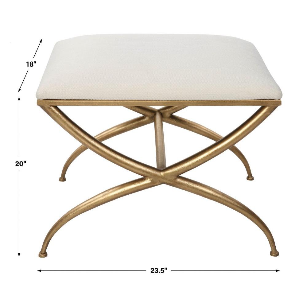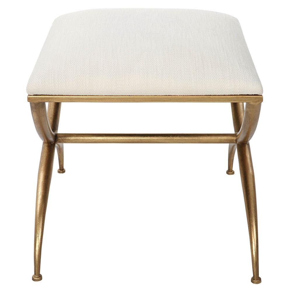 Classic Yet Stylish, This Small Bench Features A Curved Iron Frame Finished In An Elegant Gold Leaf. The Cushioned Top Is Upholstered In A Crisp White Fabric, Doubling As A Comfortable Seat Or Footrest.
