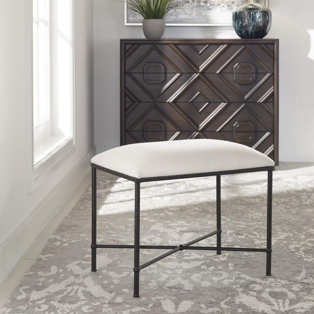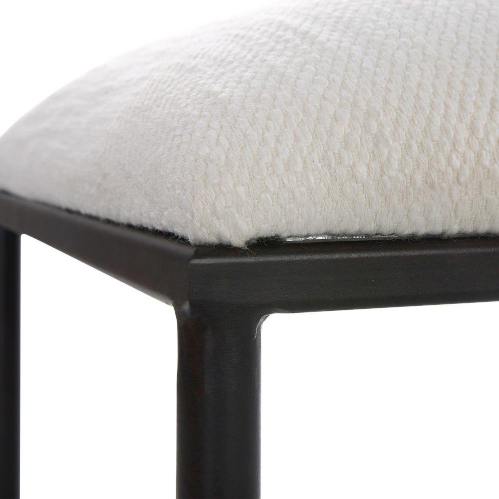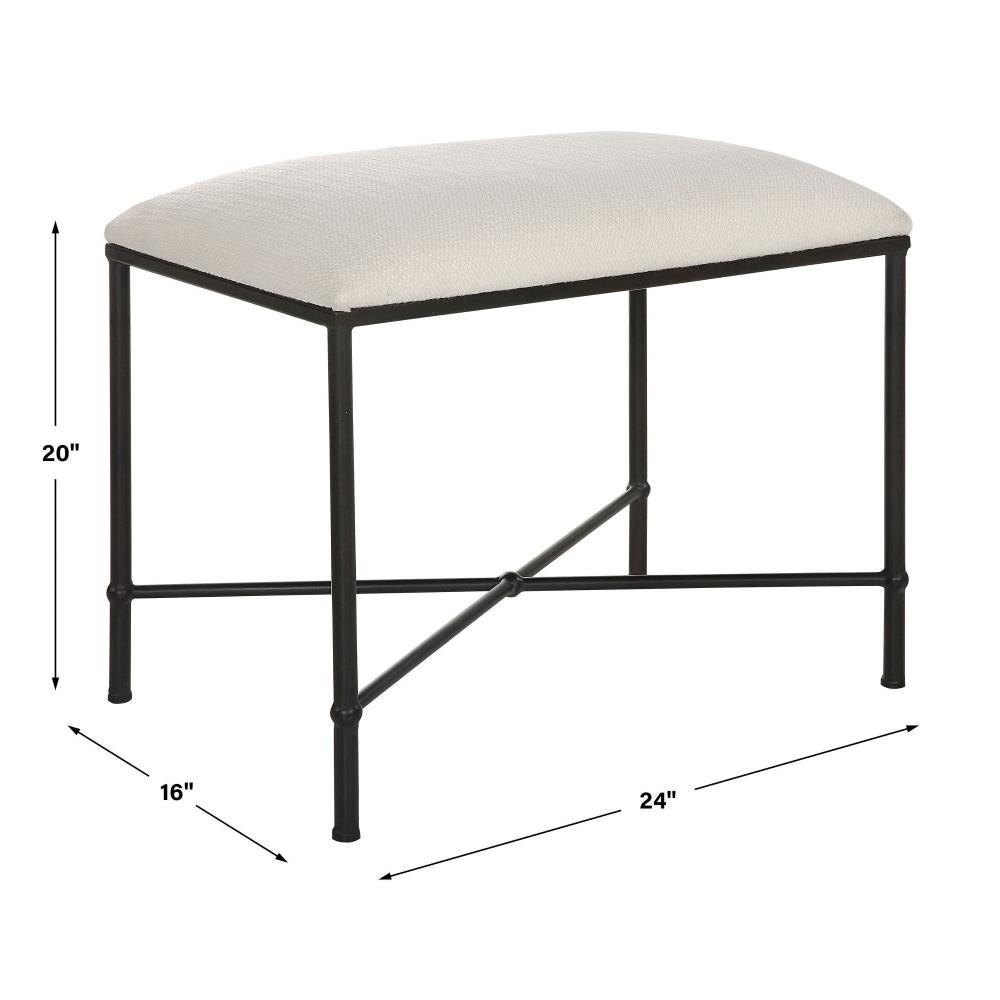 Thoroughly Modern Yet Inspired By The Classics, This Small Bench Displays A Stylish Black And White Look Featuring An Iron Frame In A Satin Finish, Upholstered In A Crisp White Textured Fabric.