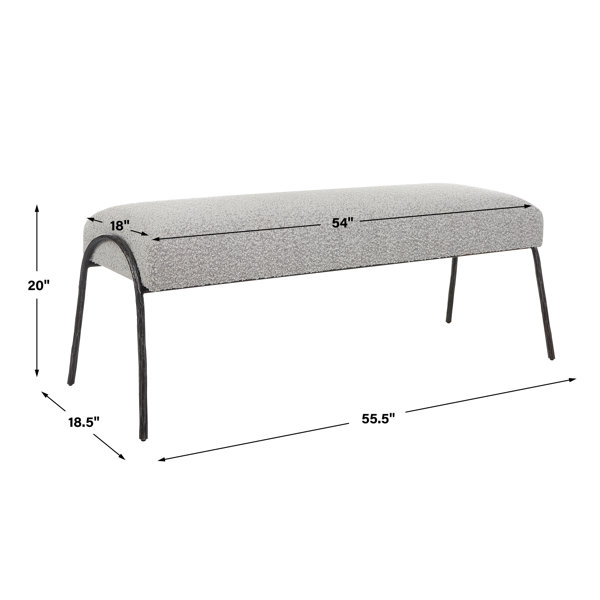 Inspired by scandinavian designs, this bench showcases elegant curved lines with a chiseled iron frame in a natural aged black iron finish. A casual warm gray textured boucle fabric accents this modern look.
