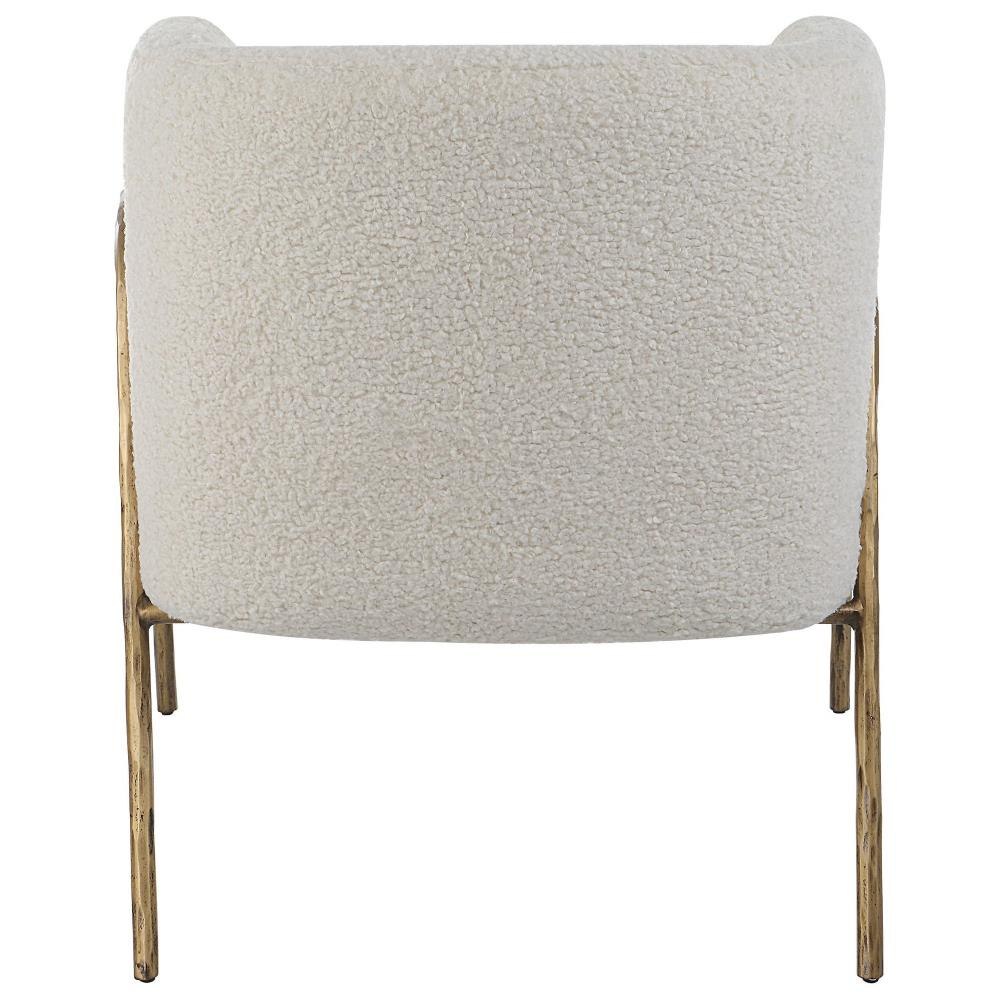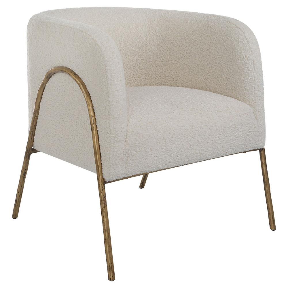 Inspired By Scandinavian Designs, This Barrel Back Style Chair Showcases Elegant Off White Faux Shearling Nestled In A Curved Chiseled Iron Frame Finished In Aged Gold. Seat Height Is 19".