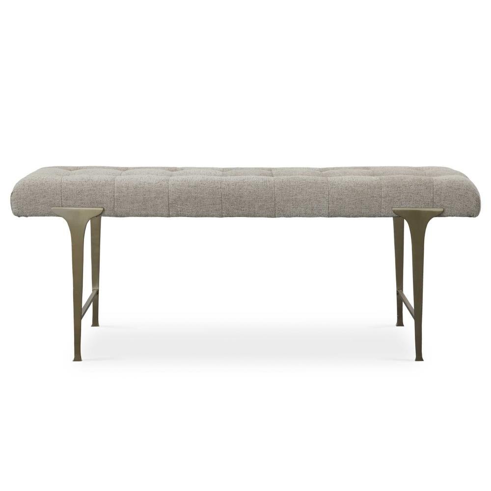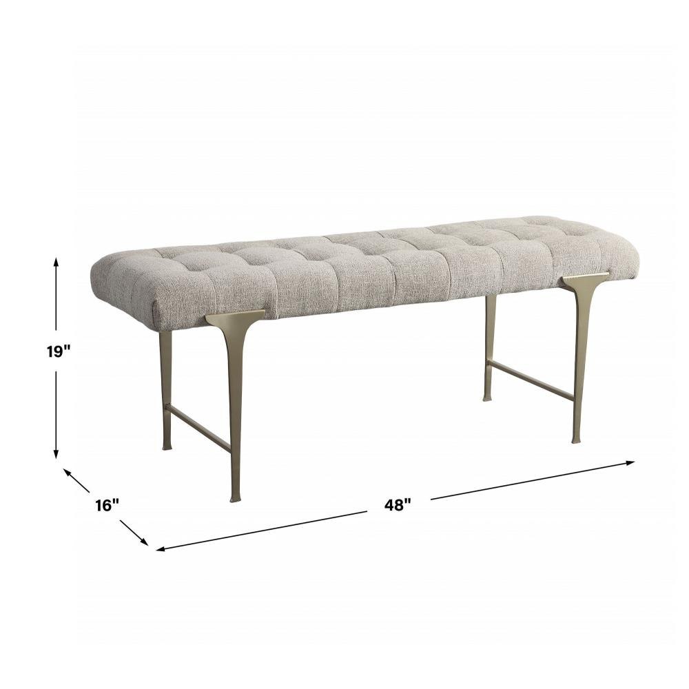 Influenced By Traditional Styling, The Imperial Bench's Cushioned Seat Is Upholstered In A Light Gray Woven Polyester With Biscuit Tufting. The Iron Frame Is Finished In Satin Champagne.
