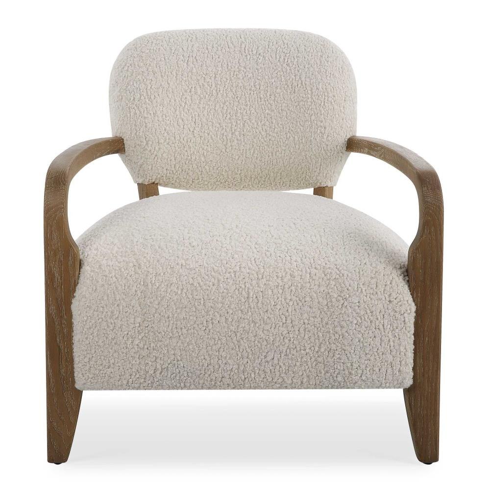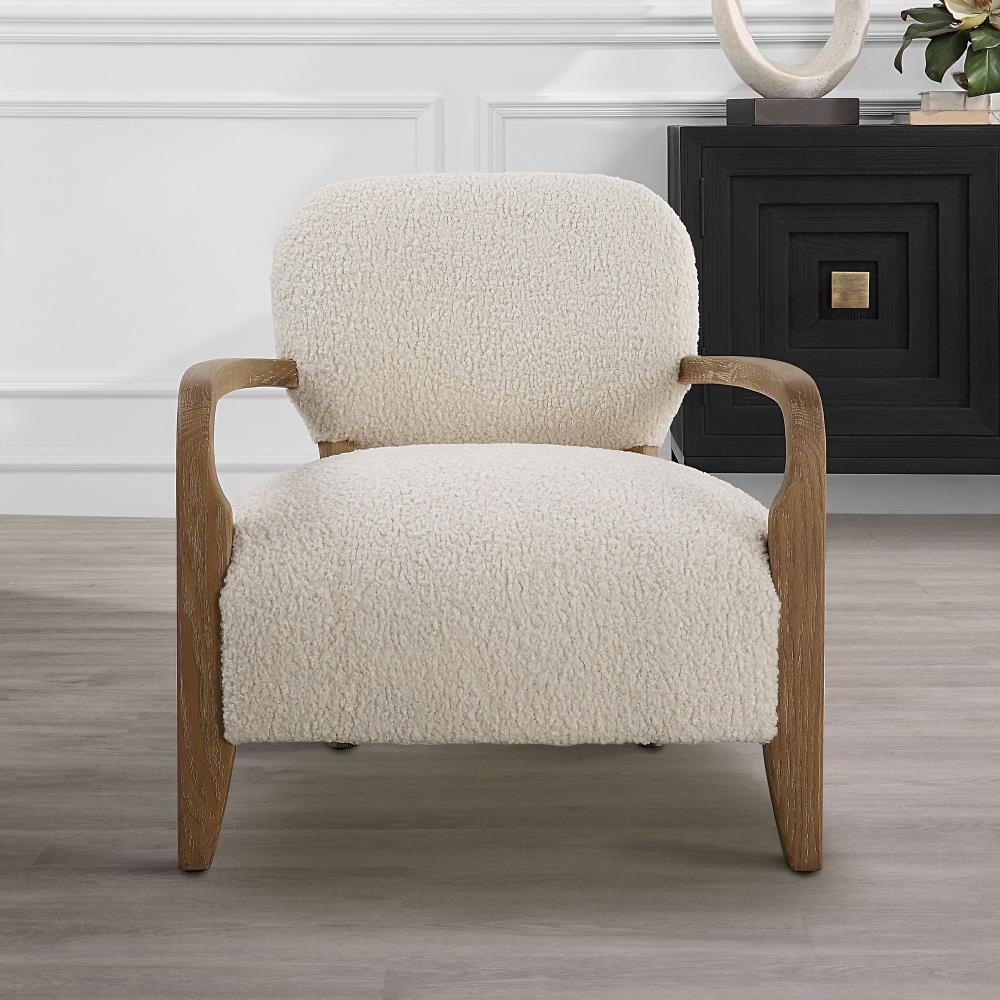 A Parisian Inspired Classic, The Telluride Accent Chair Features A Low Profile Design Upholstered In Natural Faux Shearling, Accented By A Solid Oak Tapered Frame. Seat Height Is 17".