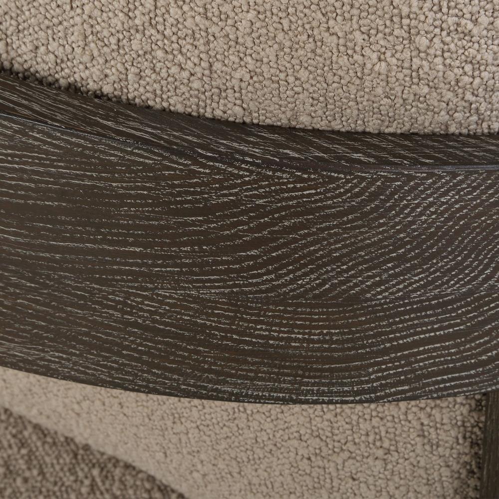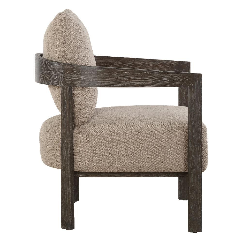 Sink Into The Comfort Of The Sienna Accent Chair. Modern Lines Of The Solid Oak Barrel Frame Are Softened With An Upholstered Seat And Support Pillow. Stained In Rich Cocoa, Paired With A Dark Sand Toned Polyester Boucle Fabric. Seat Height Is 19".