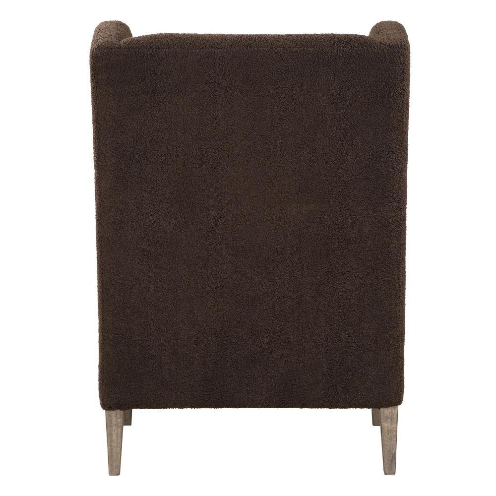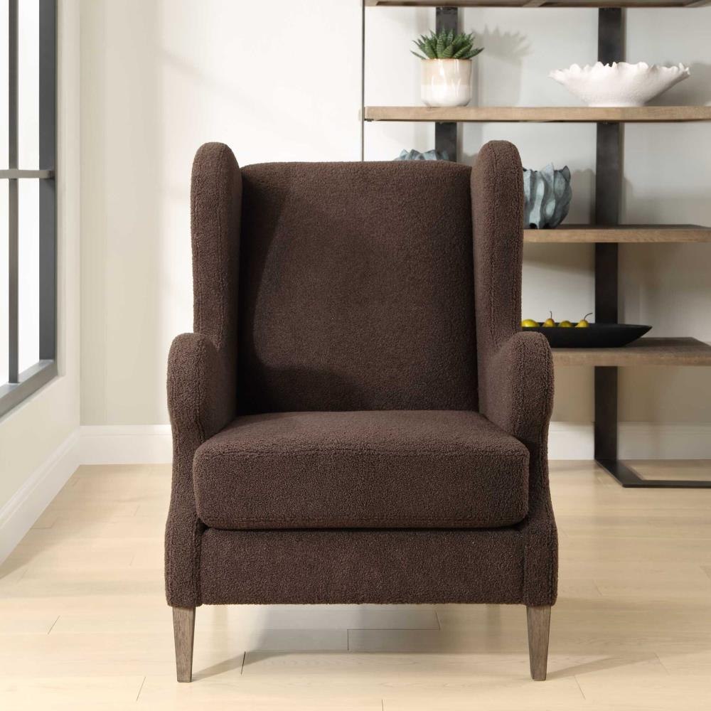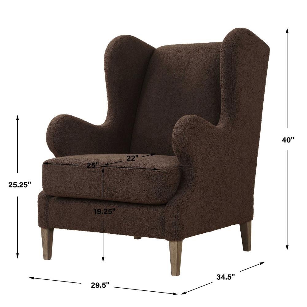 A Classic Wingback Chair With A Modern Twist. Dramatic Curved Lines Are Accentuated By The Rich Chocolate Faux Shearling. Resting On Solid Wood Tapered Legs Finished In Weathered Light Walnut. Seat Height Is 19".