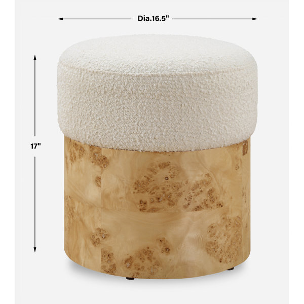 A fun, modern accent that adds a touch of nature to any room. Wrapped in beautiful poplar burl veneer in a maple finish, topped with heavily textured ivory boucle fabric.