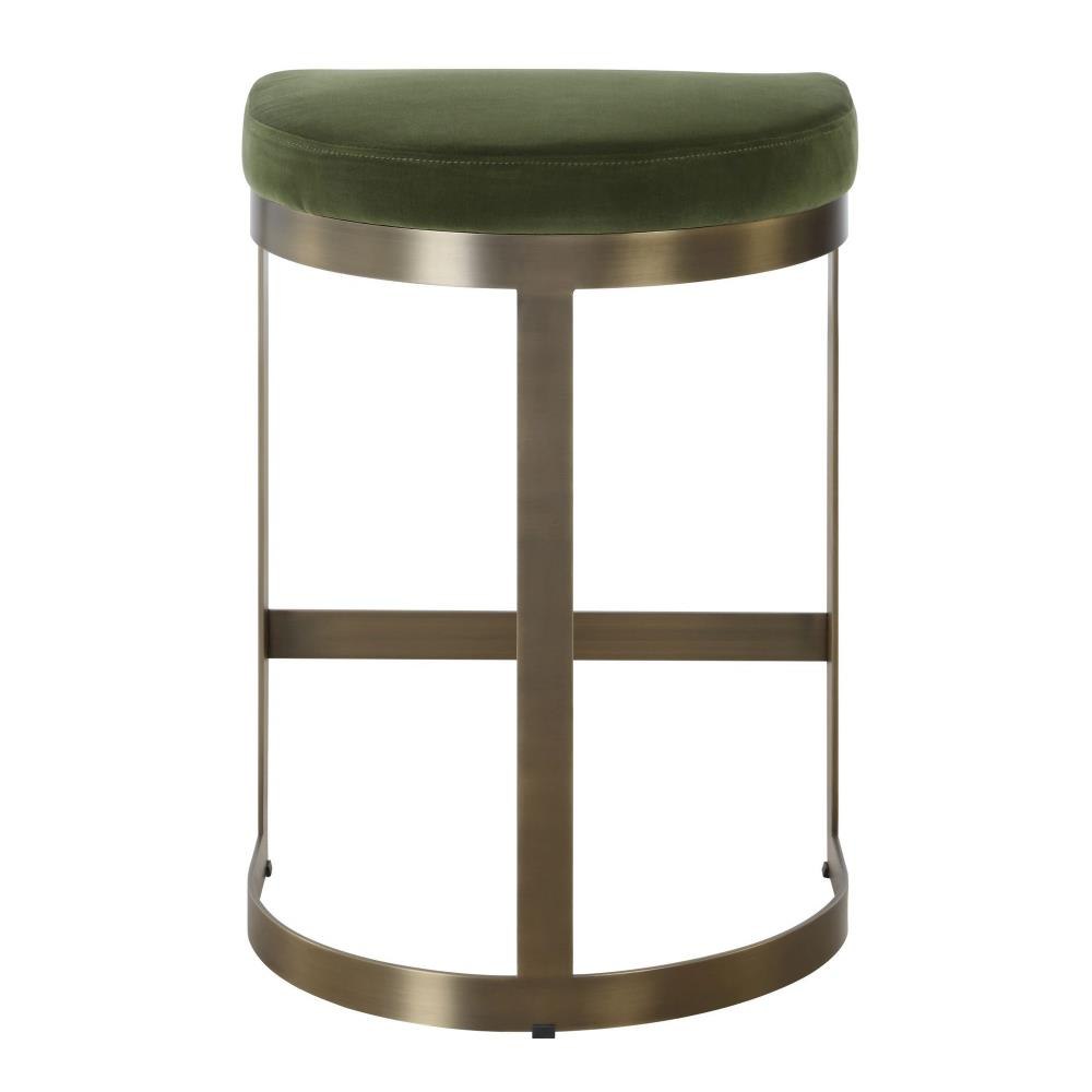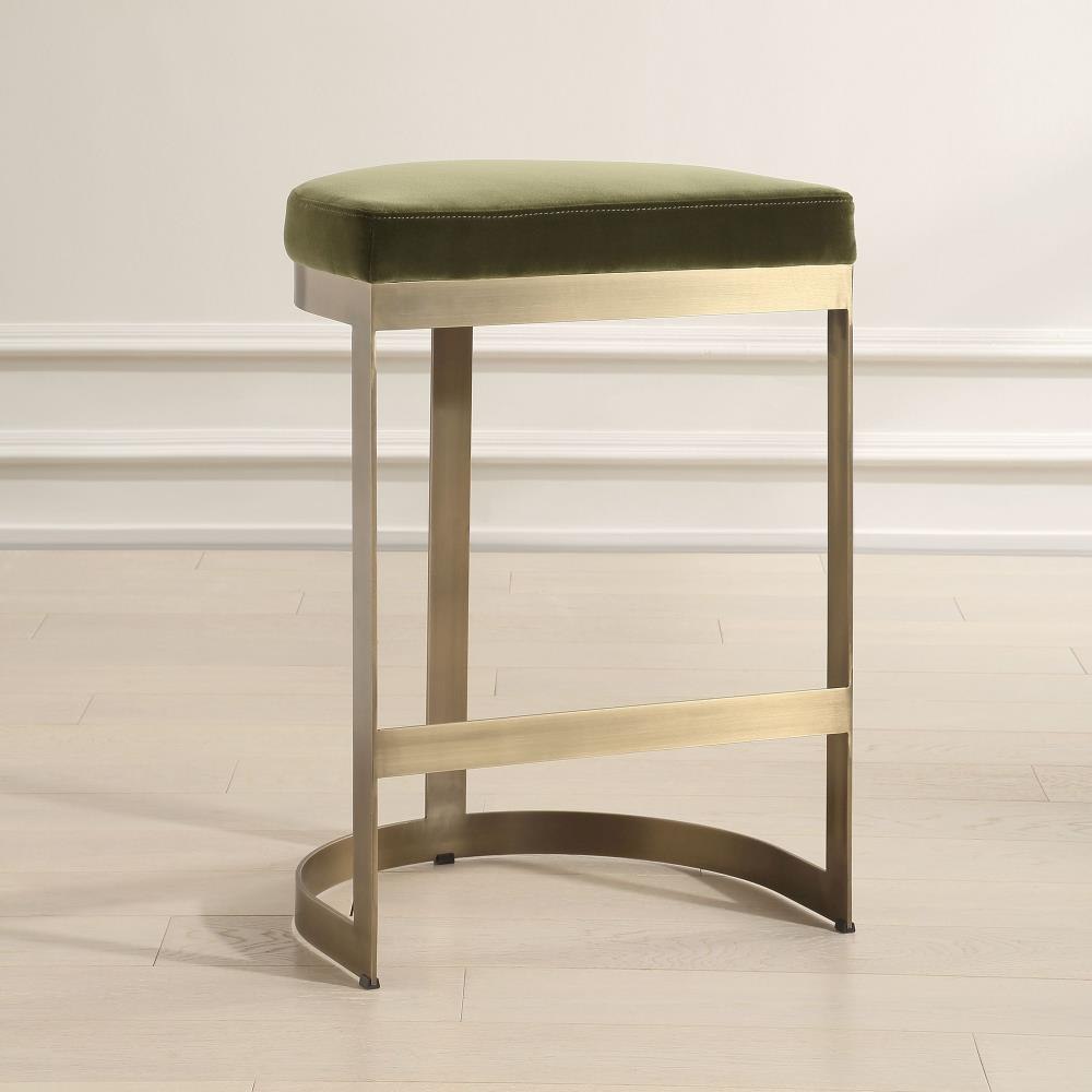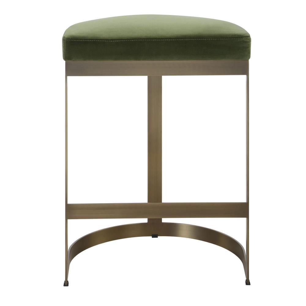 Simplistic But Sturdy, This Statement Counter Stool Features A Thick Hand Forged Iron Base Finished In A Plated Brushed Brass. Plush Seat Is Tailored In A Moss Green Polyester Velvet.