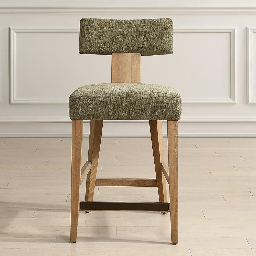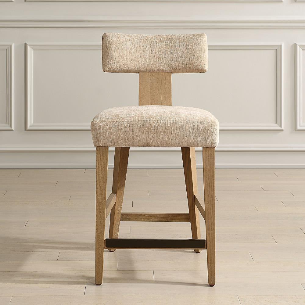 A Classic Klismos Style With A Casual Twist Featuring A Floating Back, Paired With Solid Oak In Natural With A Dark Bronze Kickplate. Upholstered In A Finely Textured, Cleanable Polyester In Sand With A Toxin-free, Eco Friendly Treatment To Help Resist Water Based Stains.