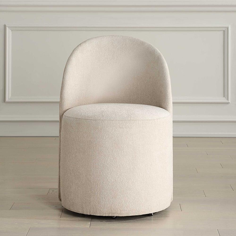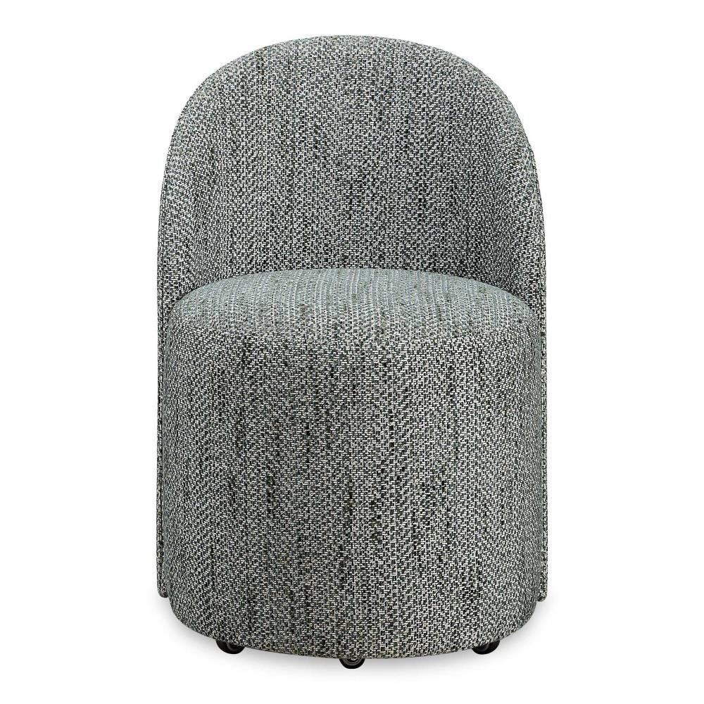 Inspired From Classic Vanity Seating But Proportioned For Dining, The Roll With It Chair Features Rolling Casters For Ease Of Use. Its Smooth Lines Are Fully Upholstered In A Textural Woven Chenille In Rich Emerald, White And Teal Tones.