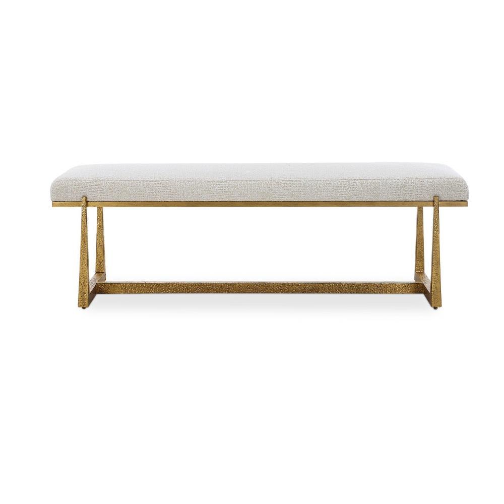 This Elegant Bench Adds A Touch Of Luxury To Any Room. The Textured Antique Gold Finish Iron Legs Perfectly Support And Accentuate The Upholstered Top In A Driftwood Toned Polyester Blend With Wool-like Texture.
