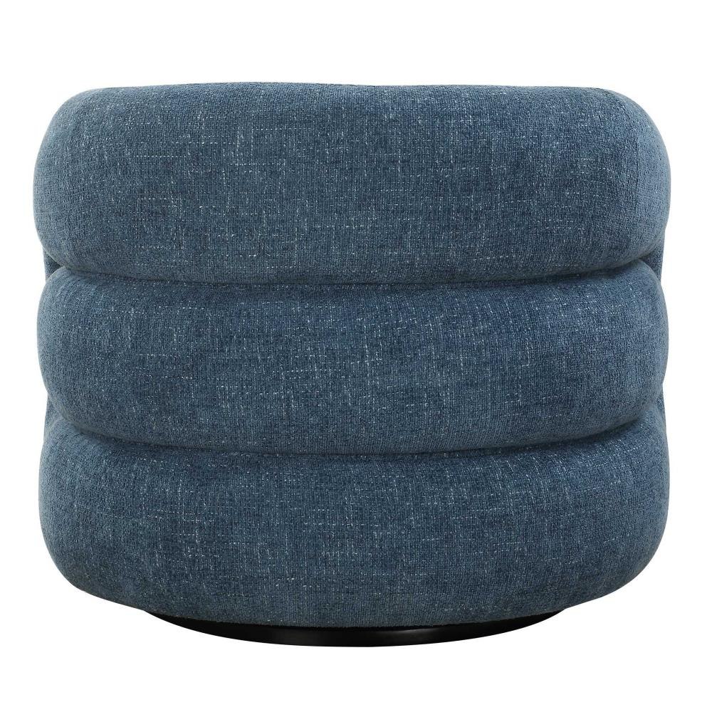 Elevate Your Living Space With This Barrel Style Swivel Chair, With A Dramatic Channeled Back Covered In A Knubby Blueberry Chenille. Rests On A Matte Black Swivel Base.