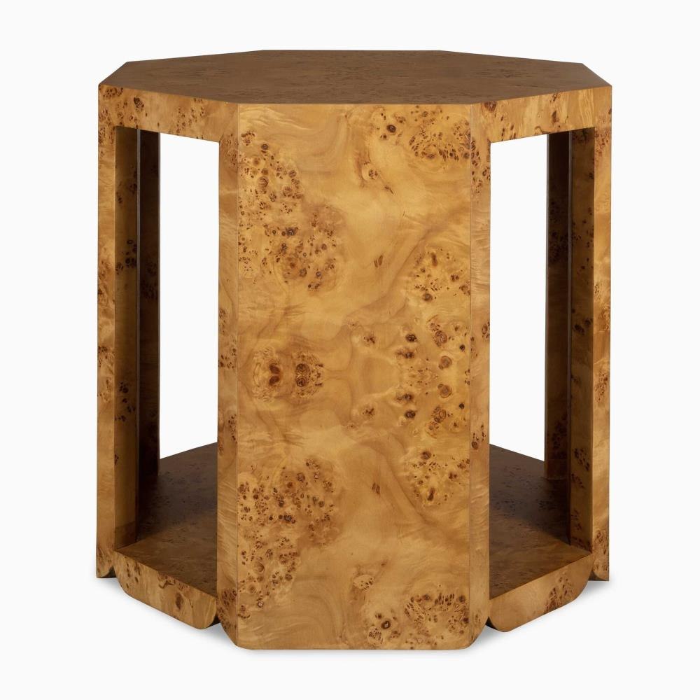 With A Natural Poplar Burl Finish, This Side Table Embodies Beautiful Symmetry And Design. Close-up Details Illustrate The Burls Treasured Finish With Deep Swirls Against The Table's Natural Warm Lighter Grains.