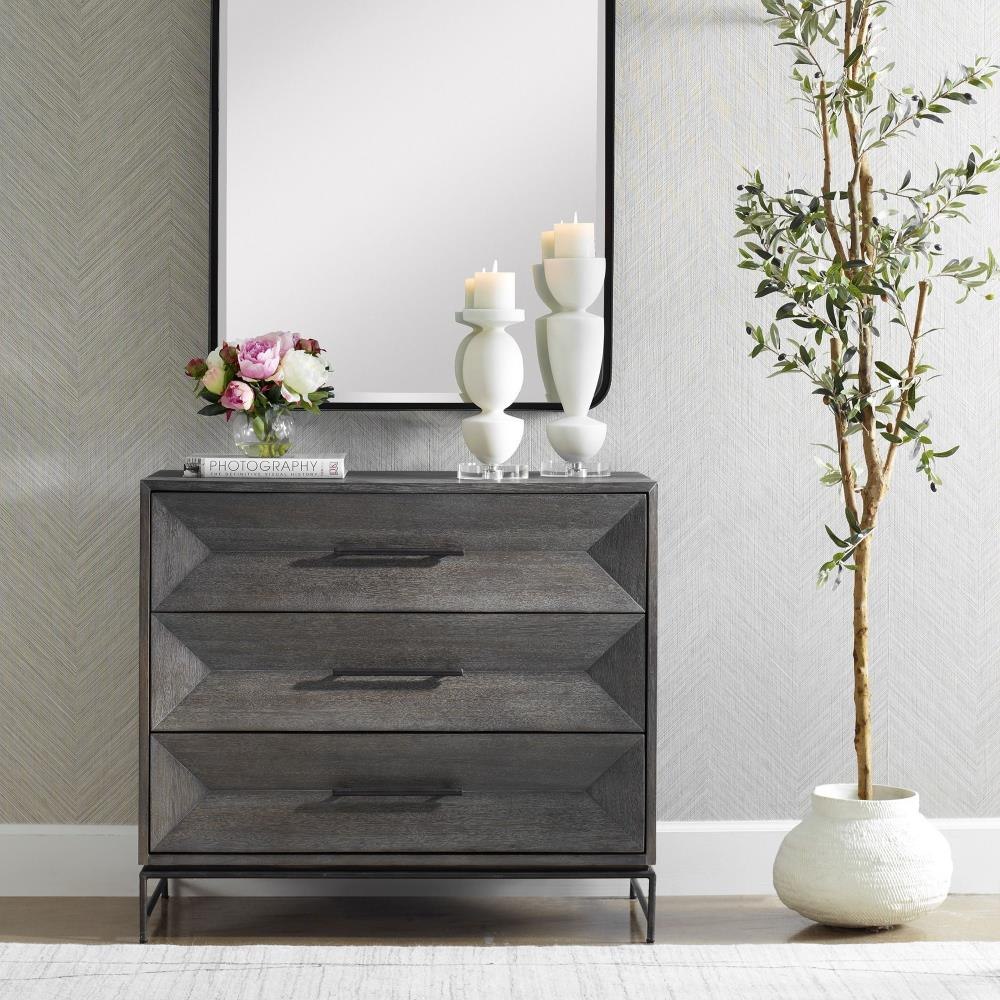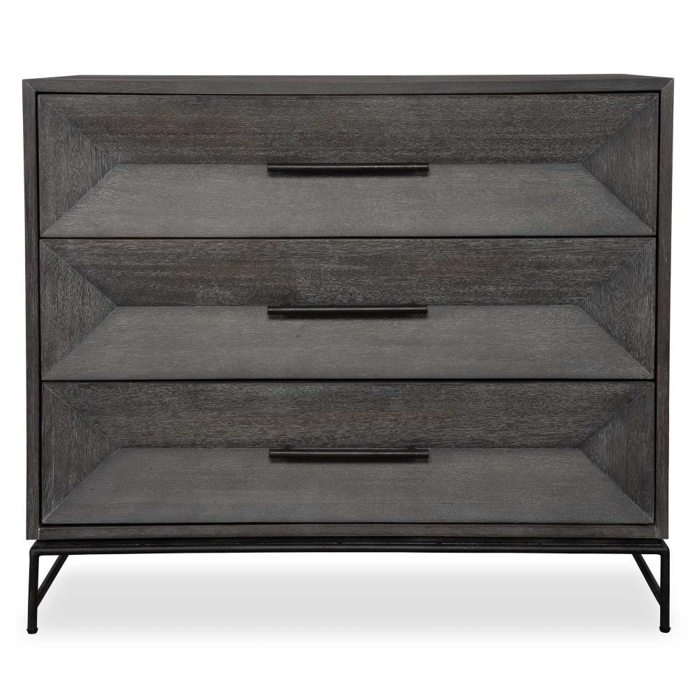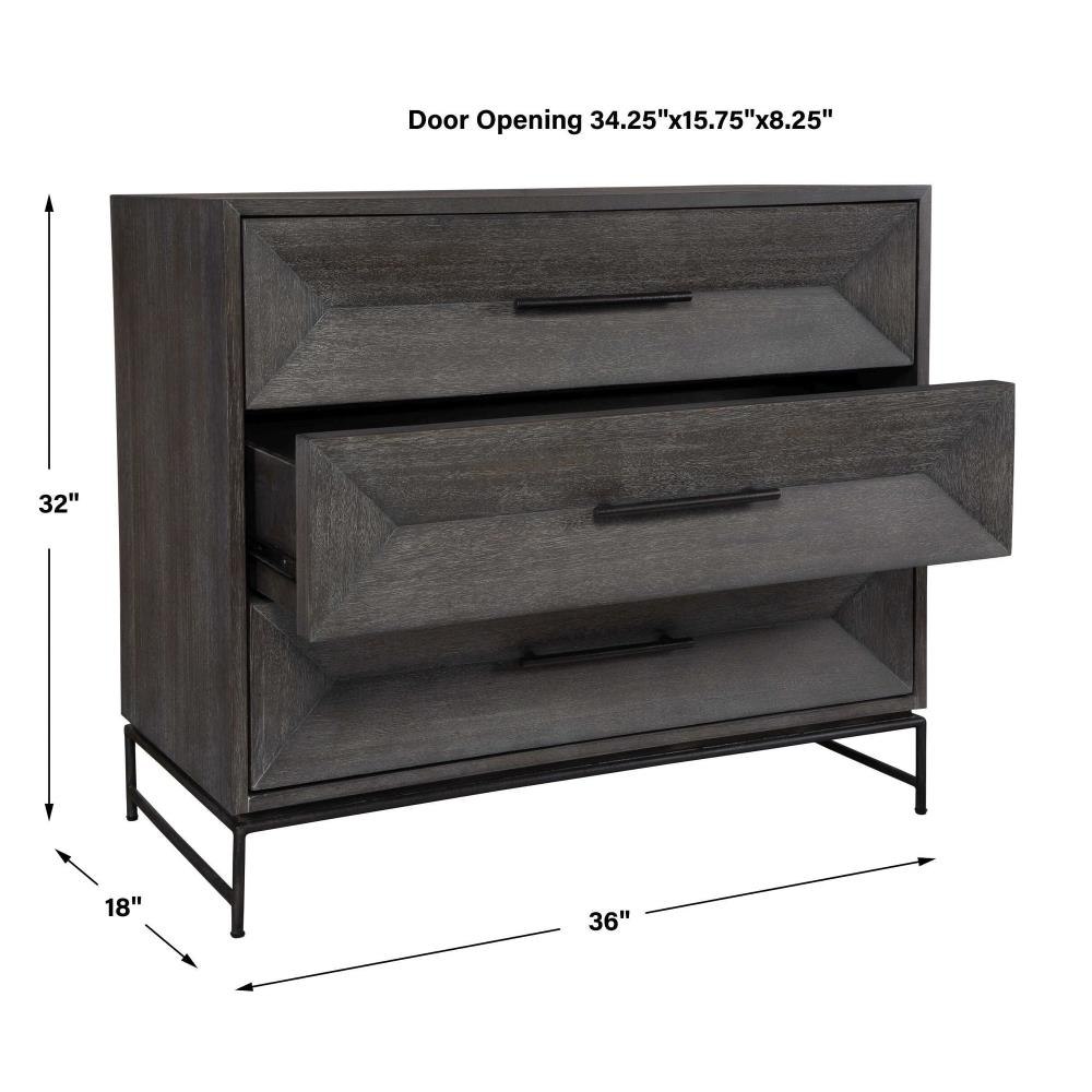 Displaying Balanced Elegance Through Its Three Symmetric Drawers This Chest Is Crafted From Rich Acacia Veneer In Dark Walnut Stain Washed With A Light Gray Glaze. Beautifully Accented By Sturdy Aged Iron Legs And Matching Hardware Pulls.