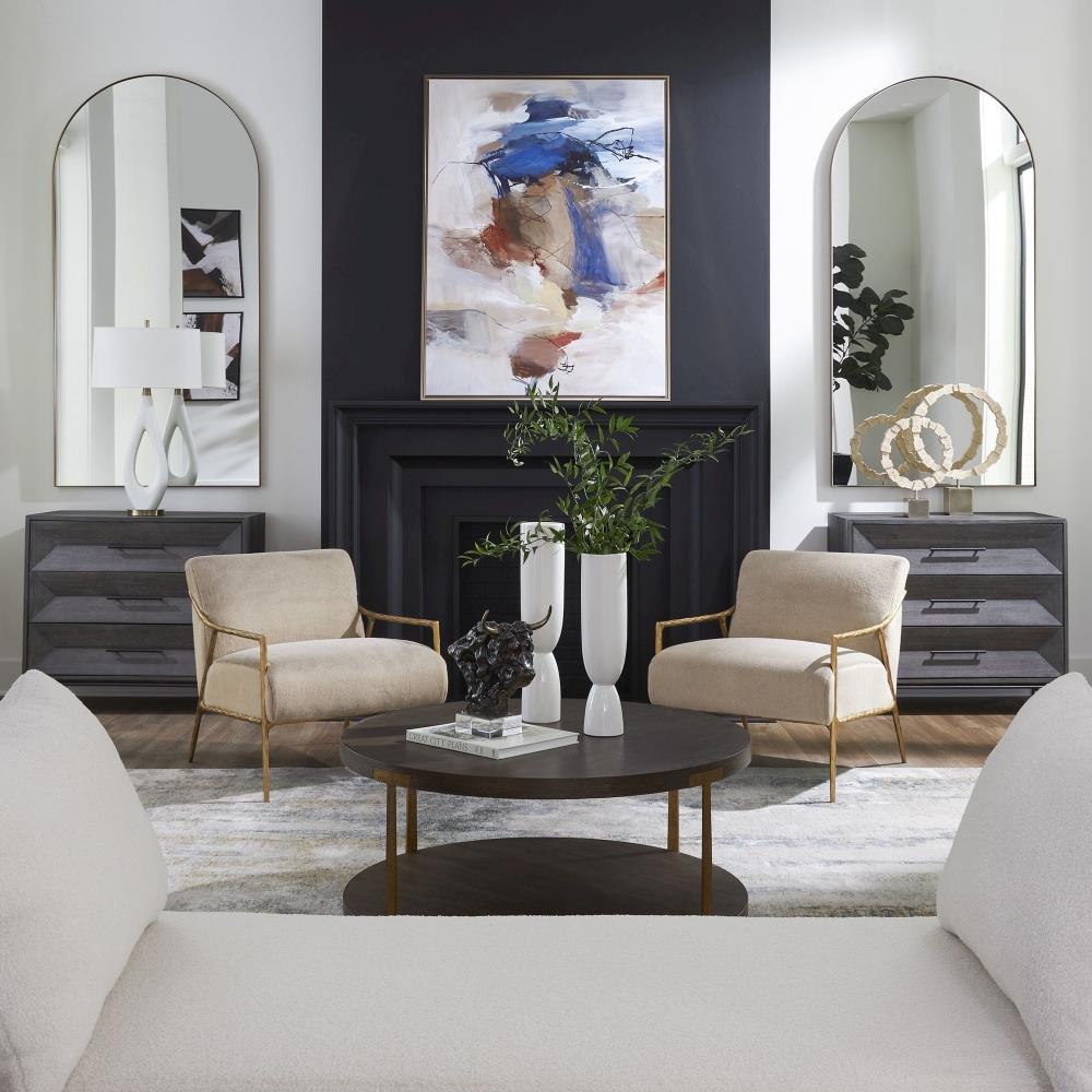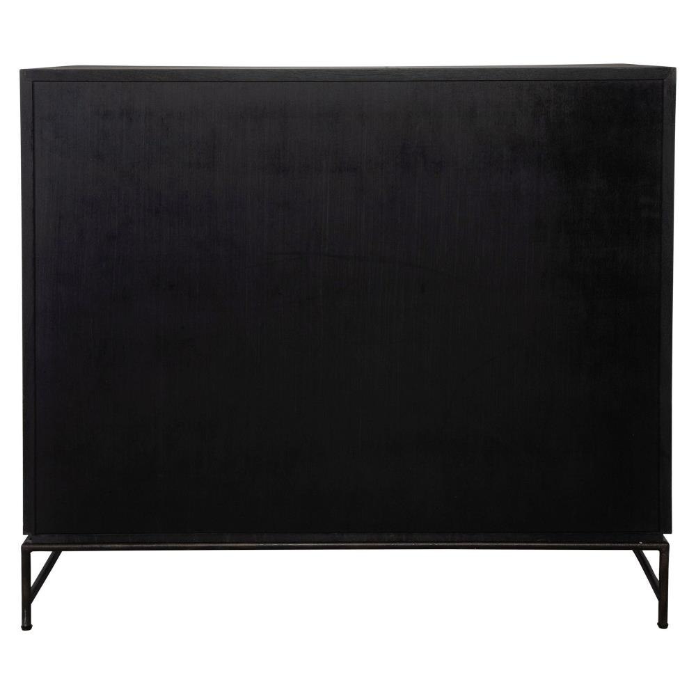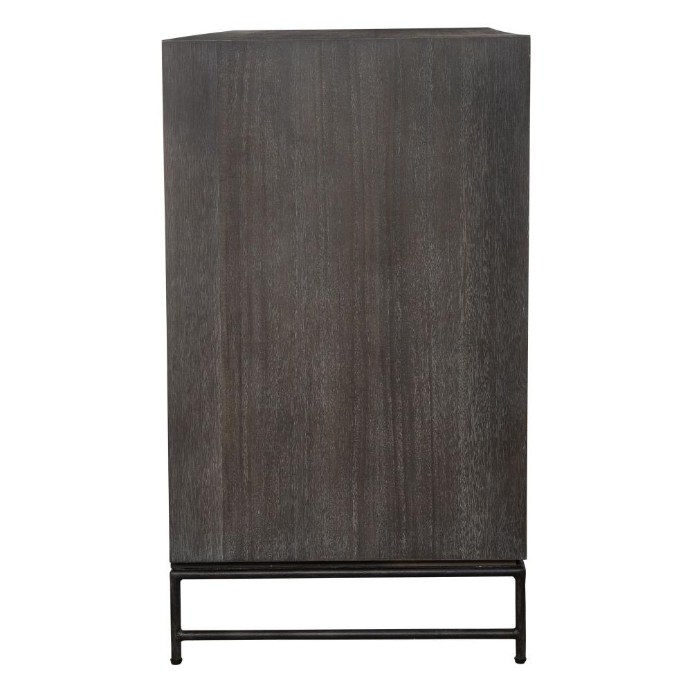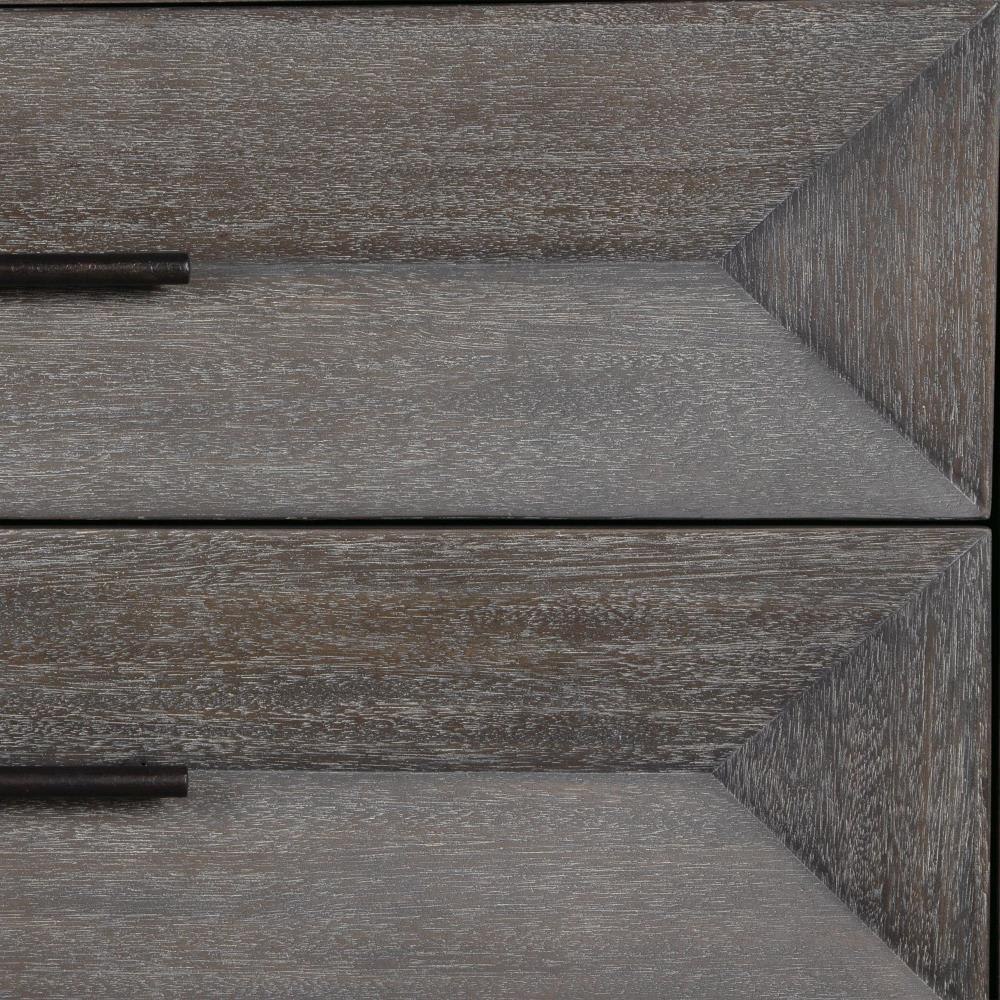 Displaying Balanced Elegance Through Its Three Symmetric Drawers This Chest Is Crafted From Rich Acacia Veneer In Dark Walnut Stain Washed With A Light Gray Glaze. Beautifully Accented By Sturdy Aged Iron Legs And Matching Hardware Pulls.