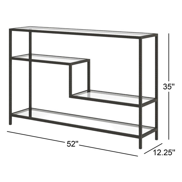 Industrially inspired function with multi-level display shelves, featuring ribbed finished in aged gunmetal with a light rust patina. Shelves are clear-tempered.