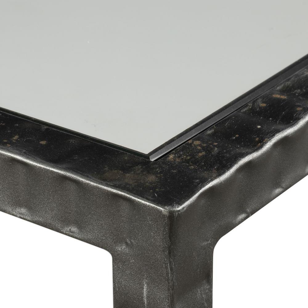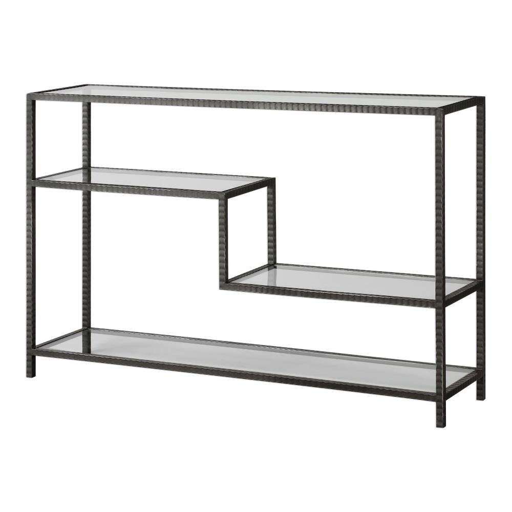Industrial Inspired Function With Multi-level Display Shelves, Featuring Ribbed Iron Finished In An Aged Gunmetal With A Light Rust Patina. Shelves Are Clear Tempered Glass.